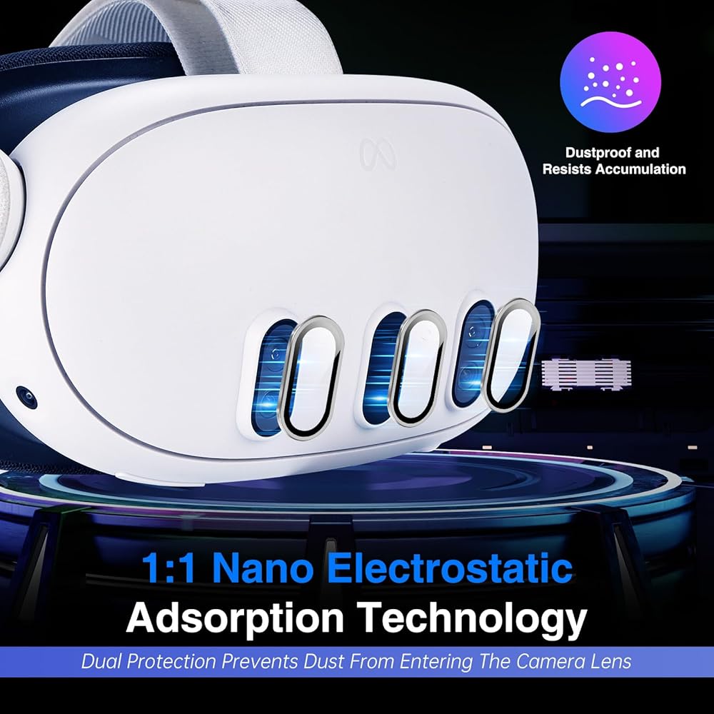 【Powerful Adsorption】Enhanced Nano-static adsorption technology makes oculus quest 3 camera lens protector effectively adsorb on the lens, tightly protects it and not easy to detach, The surface is plated with anti-fingerprint barrier technology to prevent fingerprints, sweat and grease residue