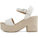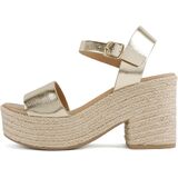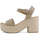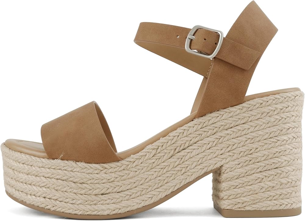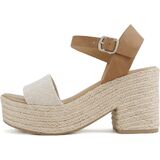 Light tan open toe adjustable ankle strap platform 1 3/4" and heel 3 3/4" heel. Material: Jute Model is a size 7 and a size 7 fits her perfectly.