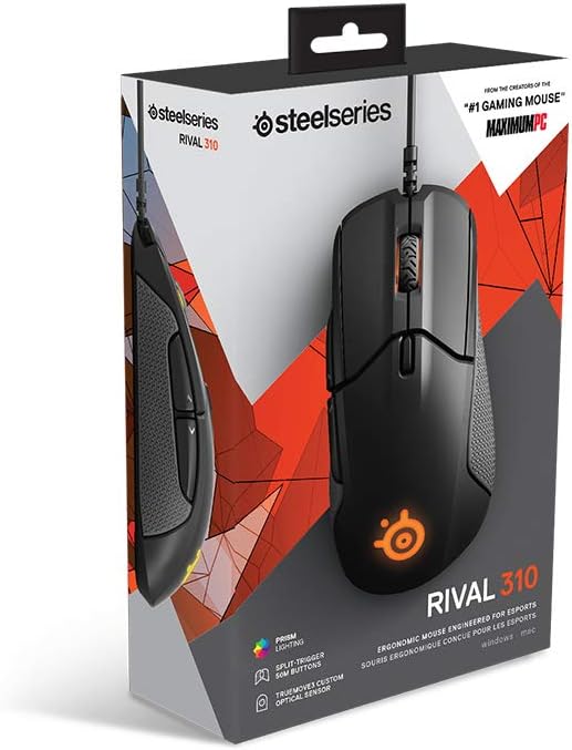 Rival 310 delivers true esports performance. Featuring the custom TrueMove3 12,000 CPI, 350 IPS optical sensor and exclusive split-trigger buttons, you'll have the power of ultra-low-latency, rapid-response tracking and the performance of lightning-quick clicks. The world-renowned ergonomic Rival design gives you the same comfort and confidence the pros rely upon. Plus, Prism RGB illumination with lighting sync, six programmable buttons, on-board memory and a light, durable construction combine to deliver the ideal esports mouse.