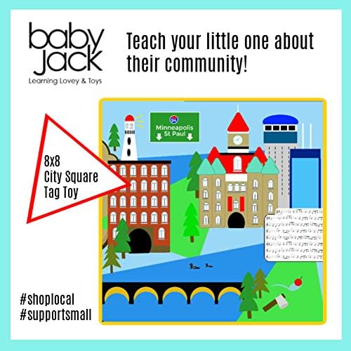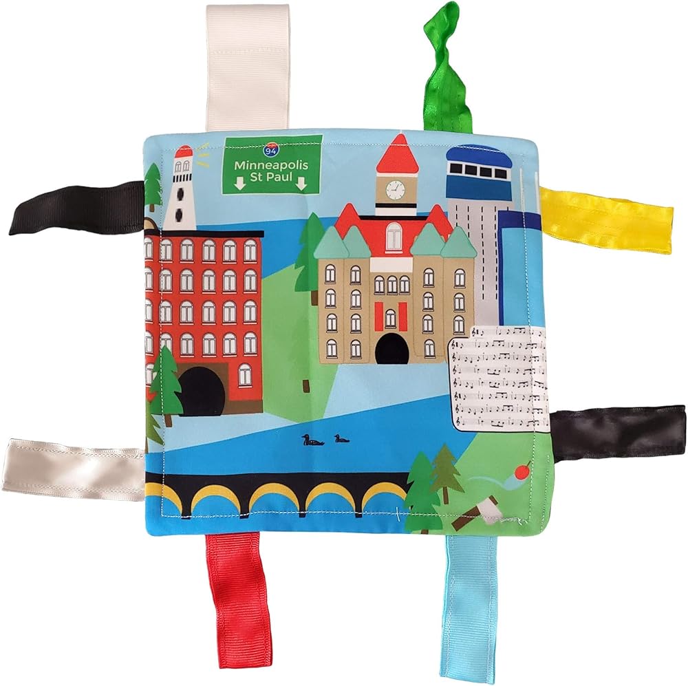 A crinkle baby Twin Cities sensory square for little ones to enjoy. Community is so important, this is a fun way to explore St. Paul and Minneapolis. Identify the landmarks, the buildings and everything you see as you travel with baby. So many sounds, textures and colors to play with. Babies love our Tabs and Moms love that it provides comfort and play. Allows entertainment and stimulation along with security to learn about this amazing city. Ribbon Tabs are sewn shut - double stitched - to prevent tiny fingers from getting intertwined in loops. We attach a teether toy link to attach to stroller / carrier.