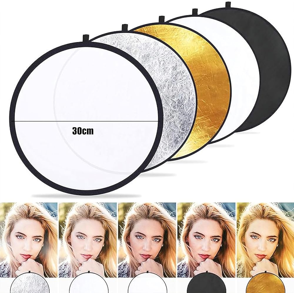 لوحة ضوء دائرية قابلة للطي وعاكس للتصوير الفوتوغرافي مقاس 12 بوصة/30 سم 5 في 1 مع حقيبة لإضاءة التصوير الفوتوغرافي في الاستوديو والإضاءة الخارجية - شفافة وفضية وذهبية وأبيض وأسود