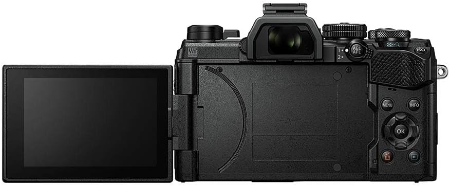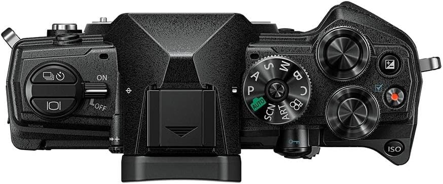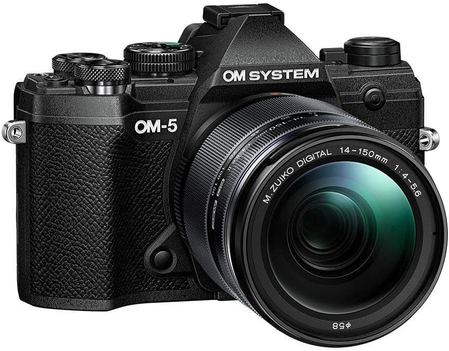 كاميرا OM SYSTEM OM-5 Micro Four Thirds System متضمنة. عدسة M.Zuiko Digital مقاس 14-150 مم F4-5.6 II، مستشعر MOS مباشر بدقة 20 ميجابكسل، تثبيت صورة محسّن بخمسة محاور، IP53، لقطة عالية الدقة محمولة باليد، أسود/أسود