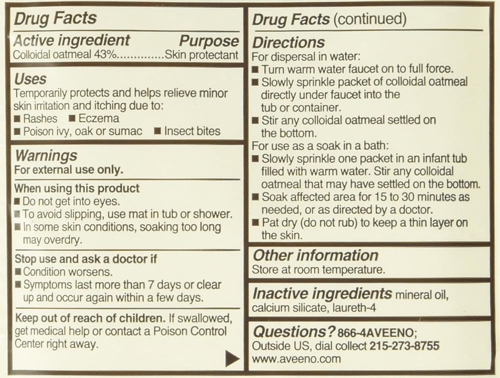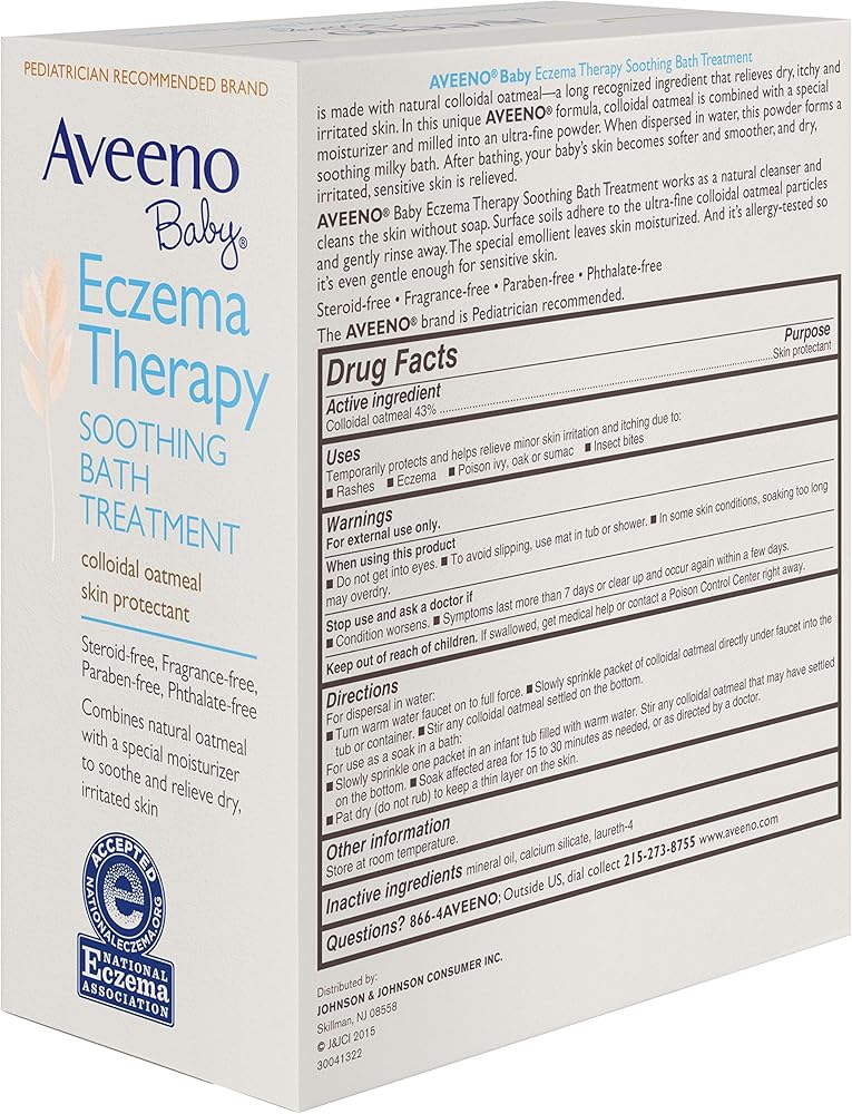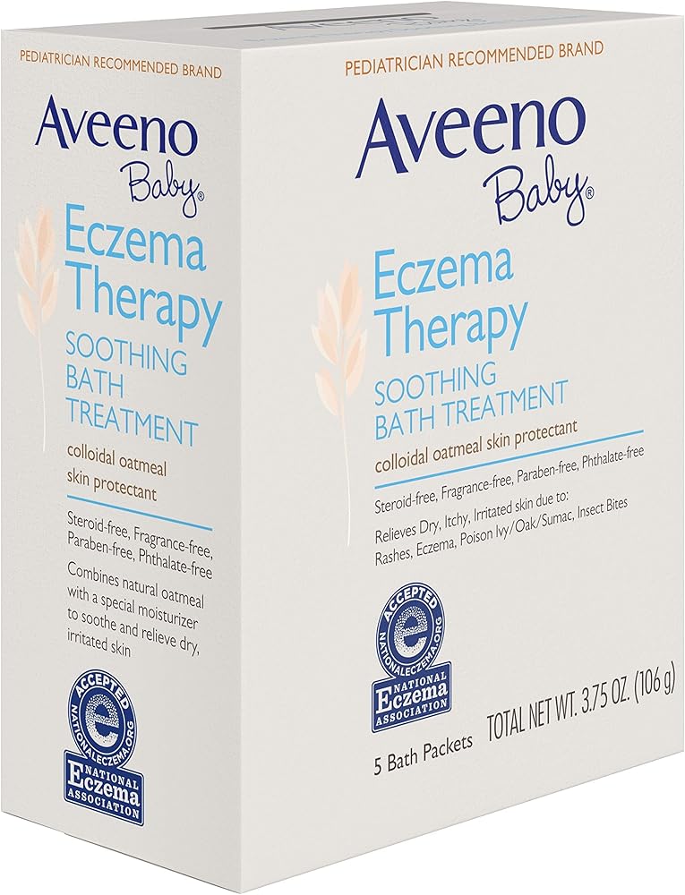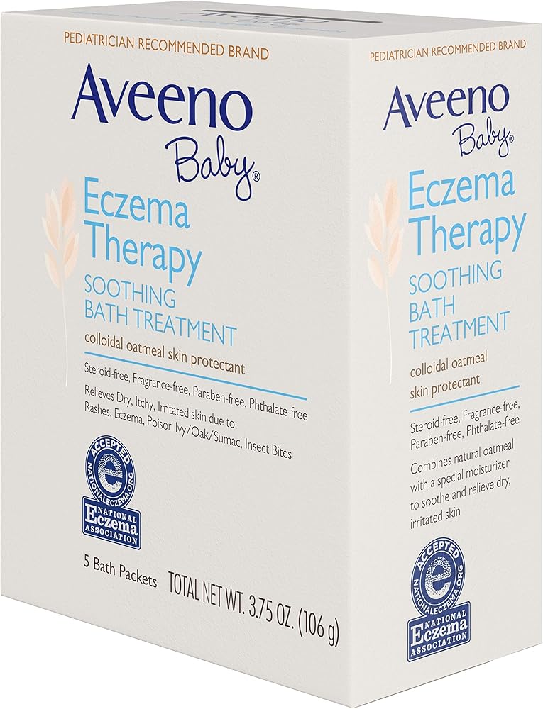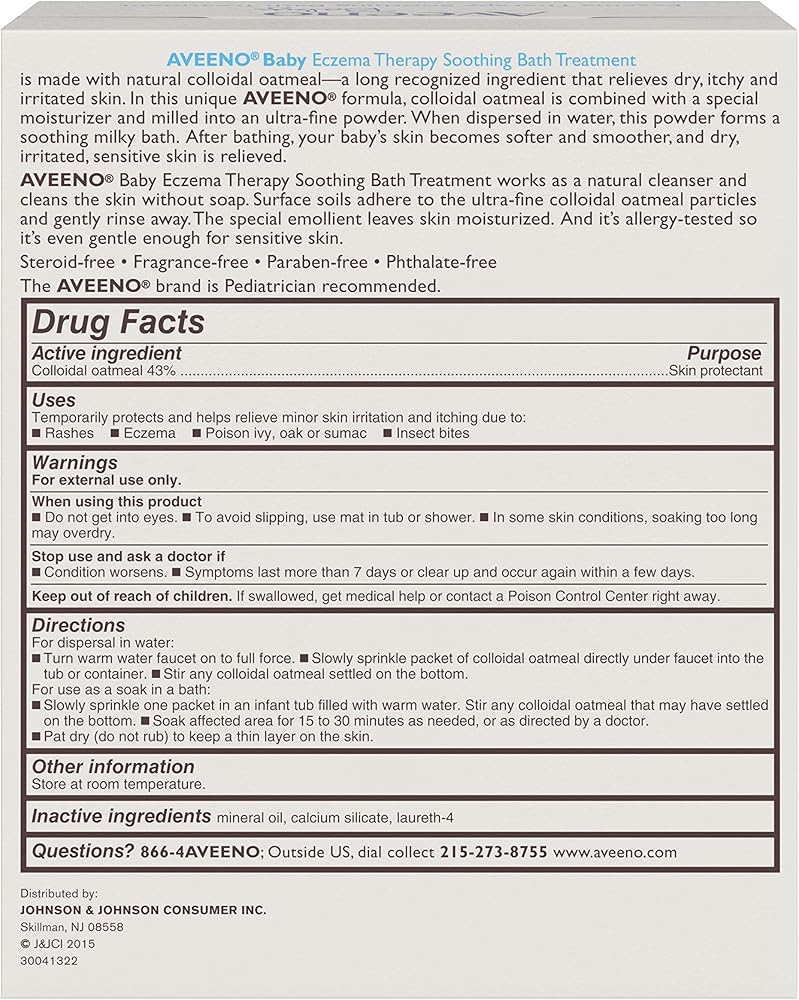 • 5-packets of Aveeno Baby Soothing Bath Treatment to help relieve dry, itchy, irritated skin due to rashes, eczema, poison ivy/oak/sumac, or insect bites