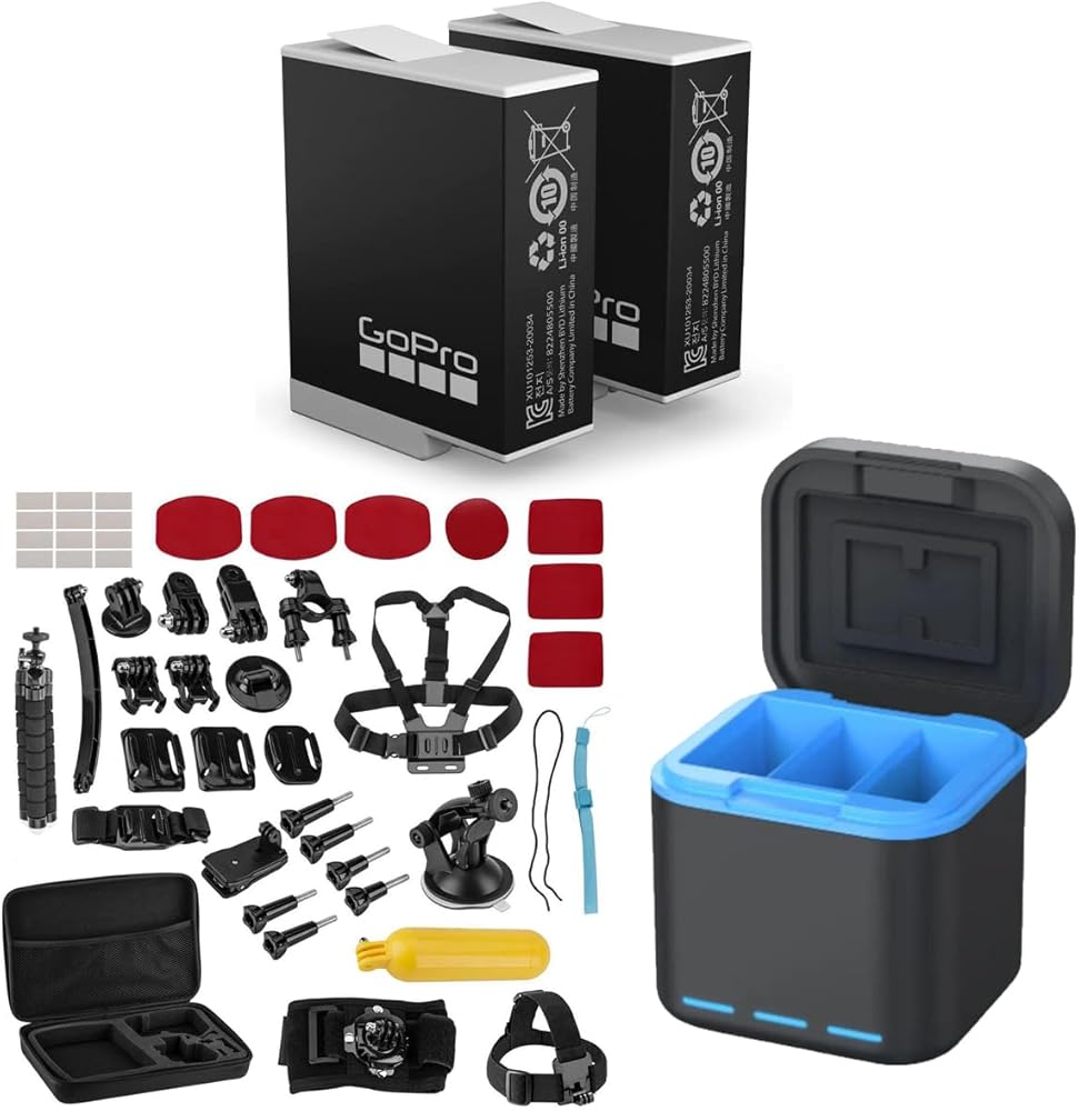 بطارية ليثيوم أيون قابلة لإعادة الشحن من جو برو إندورو بقدرة 1720 مللي أمبير في الساعة لكاميرات HERO12/11/10/9، عبوتان - حزمة مع مجموعة ملحقات GoPro مكونة من 40 قطعة، وشاحن بطاريات ثلاثي