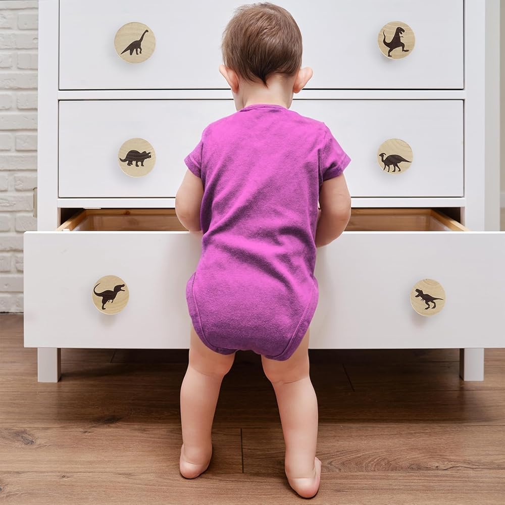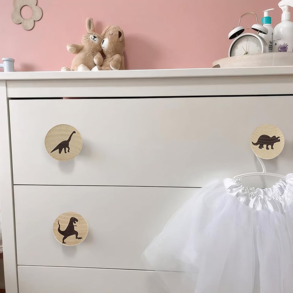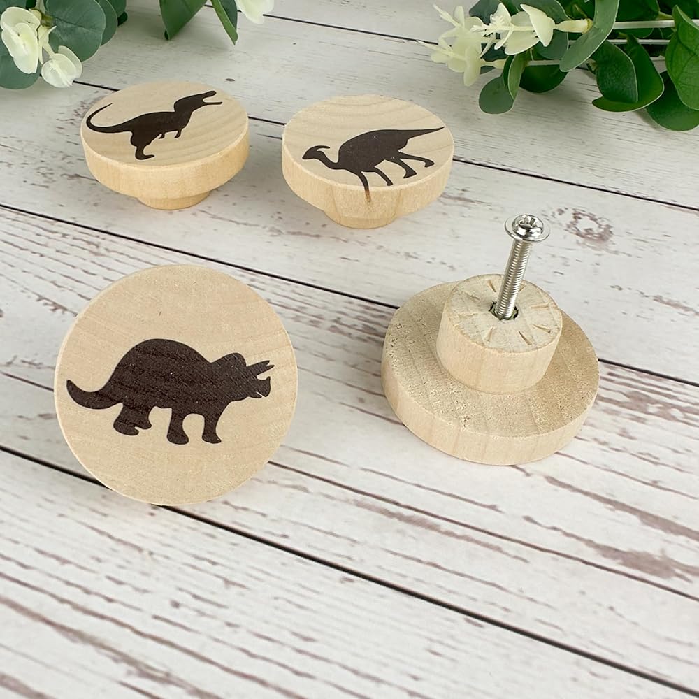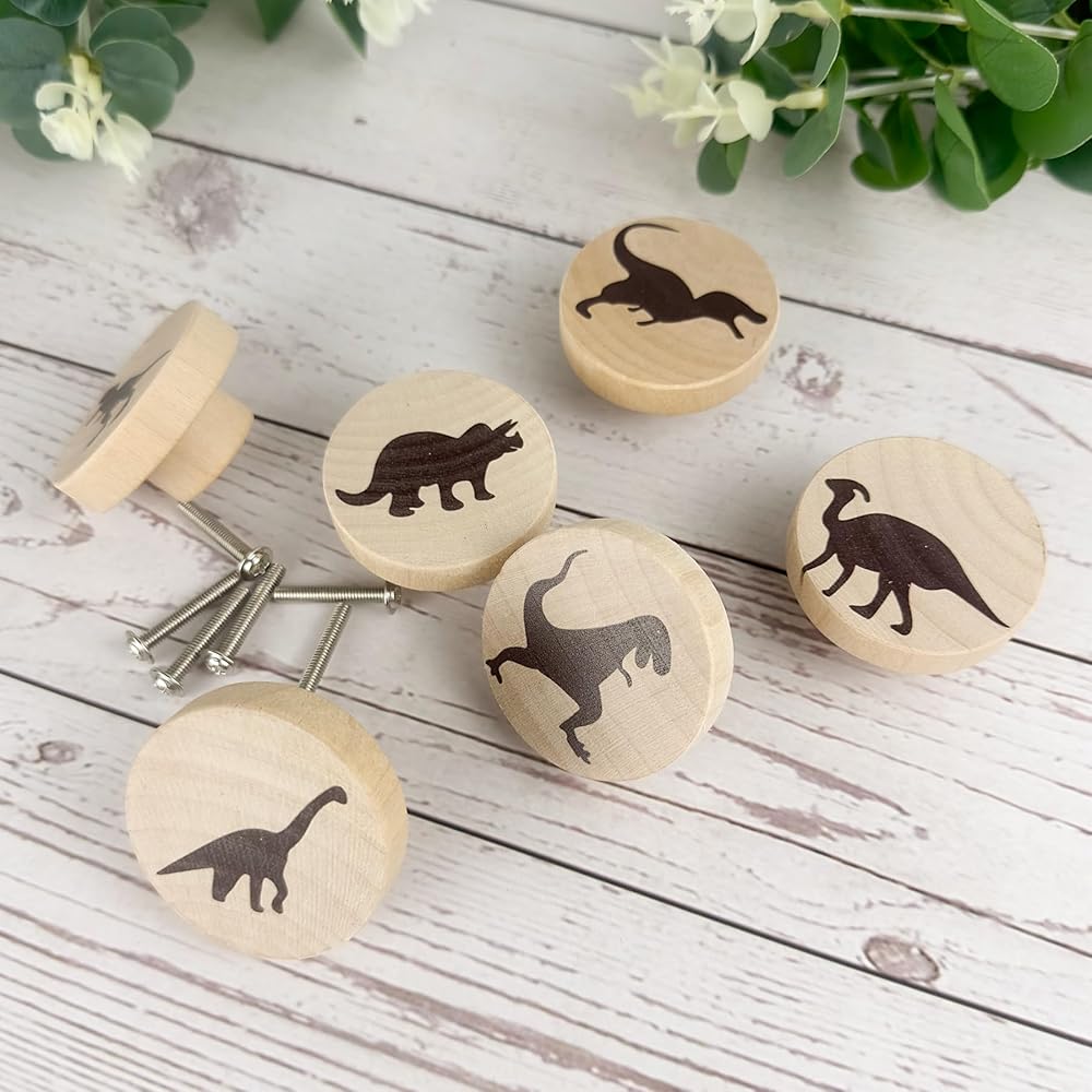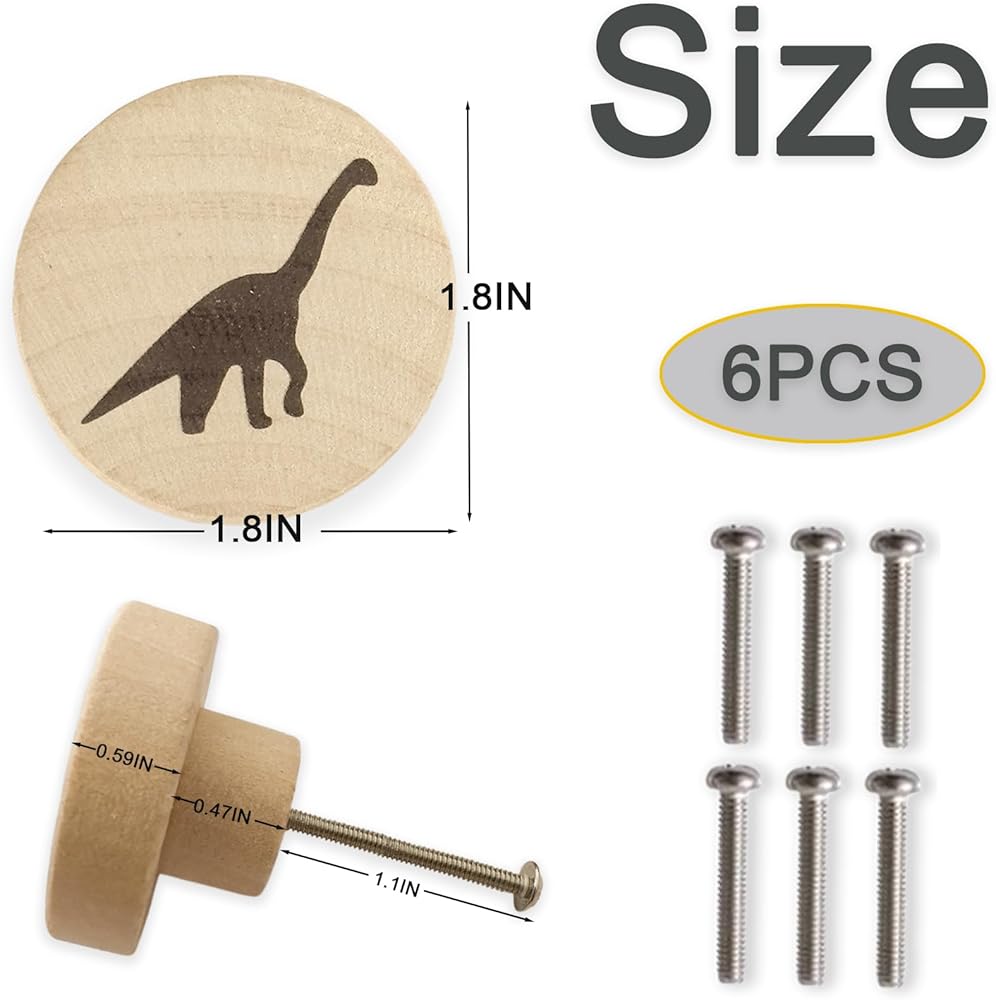 Product Details: You will be receiving a set of 6 dinosaurs-themed flat wood knobs, each with a diameter of 1.9 inches and a height of 1.1 inches. Included with your knobs are 6 complementary screws for your convenience.Built to Last: These unique dinosaur-themed wooden drawer pulls are crafted from high-grade wood and come equipped with screws. They are made not to break or deform easily, offering reliability and safety. Consequently, these charming furniture knobs are designed to provide long-lasting service and endure through the years.