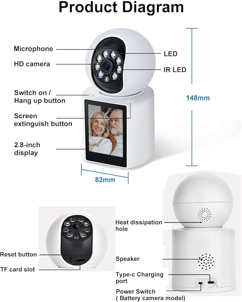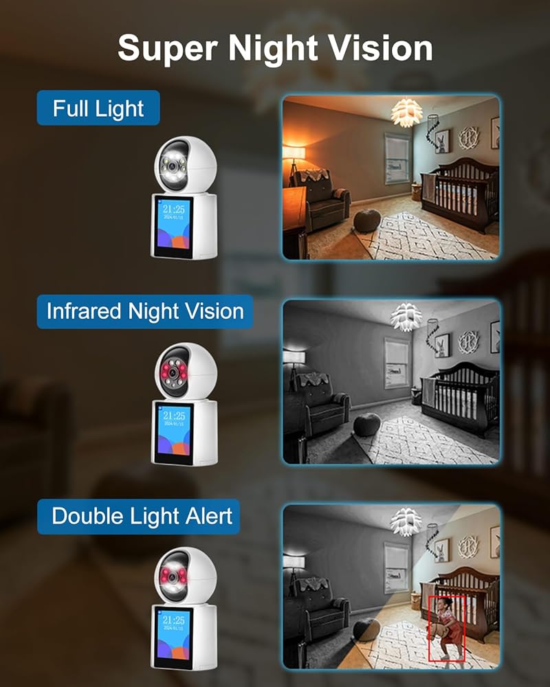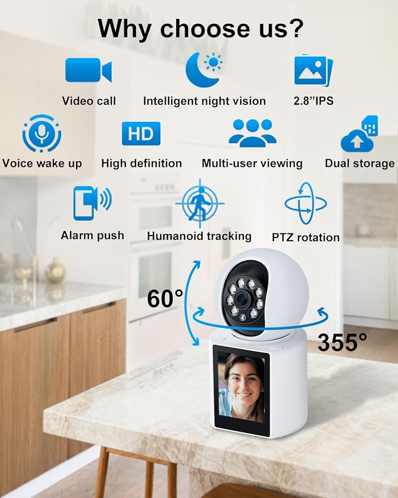 كاميرا داخلية لمكالمات الفيديو مع شاشة IPS مقاس 2.8 بوصة، وكاميرا 2K ثنائية الاتجاه للأطفال/المسنين/الكلاب/الحيوانات الأليفة مع تطبيق الهاتف، واكتشاف الإنسان/الصوت/البكاء، وصوت ذكي ومكالمة بزر واحد، رؤية ليلية ملونة بالأشعة تحت الحمراء