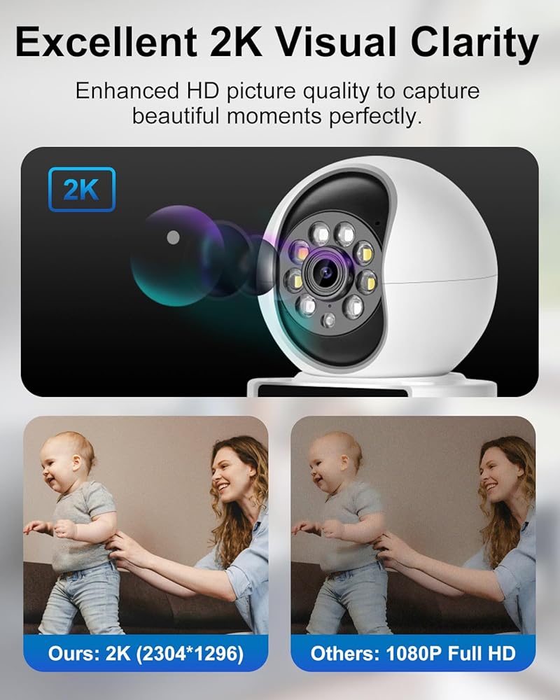 【دقة 2K وثلاثة أوضاع للرؤية الليلية】 استمتع بالوضوح الاستثنائي مع دقة HD 2K. توفر كاميرا الفيديو ثنائية الاتجاه هذه ثلاثة أوضاع للرؤية الليلية - اللون والأشعة تحت الحمراء والرؤية الليلية الذكية - للمراقبة على مدار الساعة. تضمن مصابيح LED القوية التي تعمل بالأشعة تحت الحمراء الحصول على صور واضحة حتى في الظلام الدامس، مما يزيل اللقطات الباهتة ويوفر مراقبة فائقة الدقة ليلاً ونهارًا