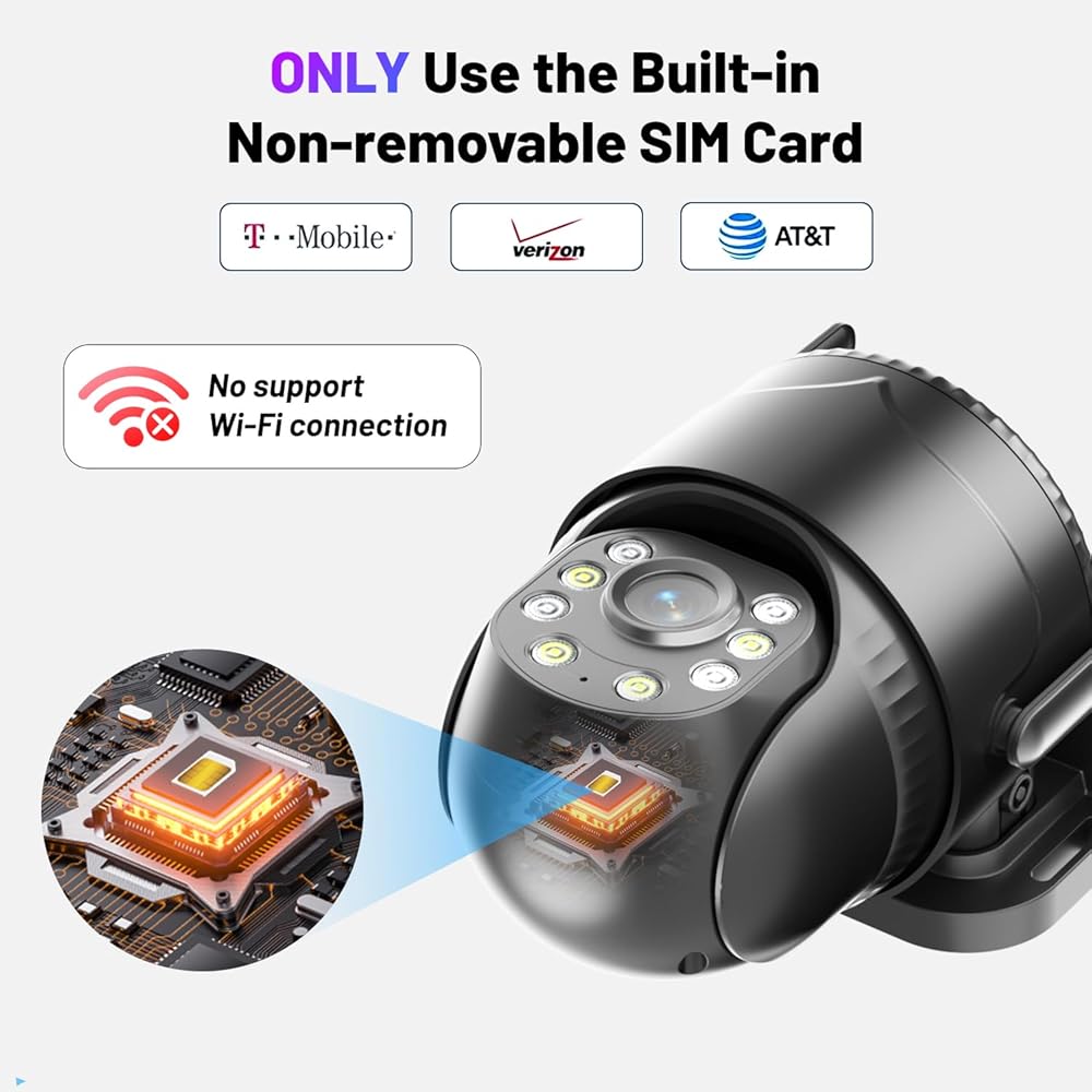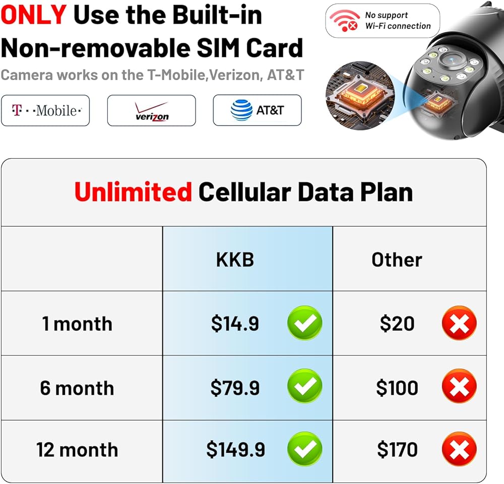 • بطاقة SIM مدمجة مع خطة بيانات غير محدودة: كاميرا أمان 4G LTE مع بطاقة SIM مدمجة غير قابلة للإزالة، تتعرف تلقائيًا على شبكات Verizon وAT&T وT-Mobile للاتصال، مما يضمن توافق الكاميرا مع الشبكة. يتم توفير 300 ميجابايت من البيانات المدفوعة مسبقًا لتوصيل الكاميرا. خطط البيانات غير المحدودة قابلة للتجديد داخل التطبيق بسعر 14.9 دولارًا أمريكيًا/الشهر، و79.9 دولارًا أمريكيًا/6 أشهر، و139.9 دولارًا أمريكيًا/السنة.