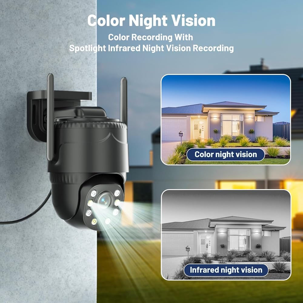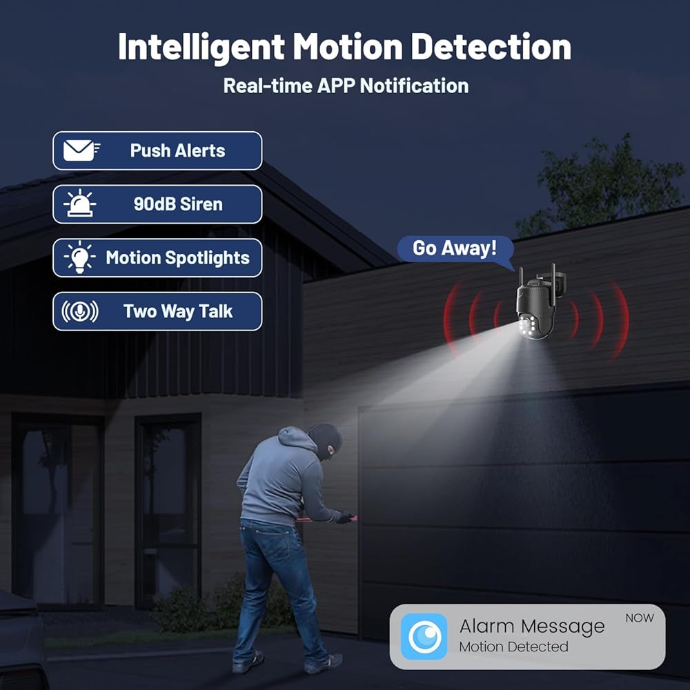 • اكتشاف PIR ورؤية ليلية ملونة 2K: مع مستشعر PIR الحساس، يمكن لهذه الكاميرا اكتشاف أي حركة لشخص أو حيوان بسرعة ودقة، ثم دفع الإشعارات إليك على الفور عبر تطبيق الهاتف المحمول، وبجودة صورة 2K وملونة. رؤية ليلية (يتم توفير رؤية ليلية بالأشعة تحت الحمراء للإضاءة المنخفضة)، ستكون أصولك محمية دائمًا، حتى في الليل.