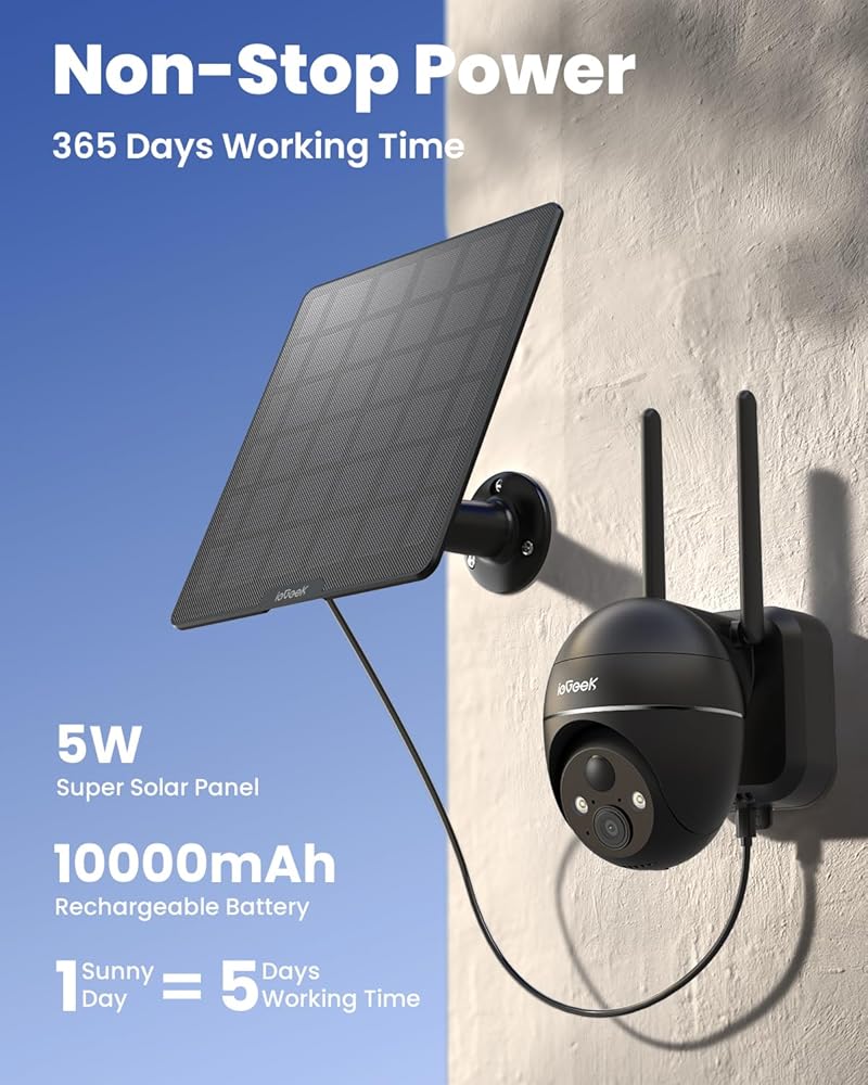【طاقة مستمرة من بطارية عالية السعة ولوحة شمسية】تحتوي هذه الكاميرا الشمسية على بطارية مدمجة بقوة 10000 مللي أمبير في الساعة مع وظيفة خالية من الأسلاك لعمر بطارية طويل. وفي الوقت نفسه، يمكن لكاميرا الأمان LTE الحصول على طاقة شمسية متواصلة من اللوحة الشمسية المضمنة بقوة 5 وات. إذا كانت كاميرا الأمان غير المزودة بشبكة wifi تسجل 20 مقطع فيديو بمعدل 10 ثوانٍ يوميًا، فستعمل بشكل طبيعي لمدة تصل إلى 3 أشهر. تخلص من مشكلة التفكيك والشحن المتكرر بنسبة 100%