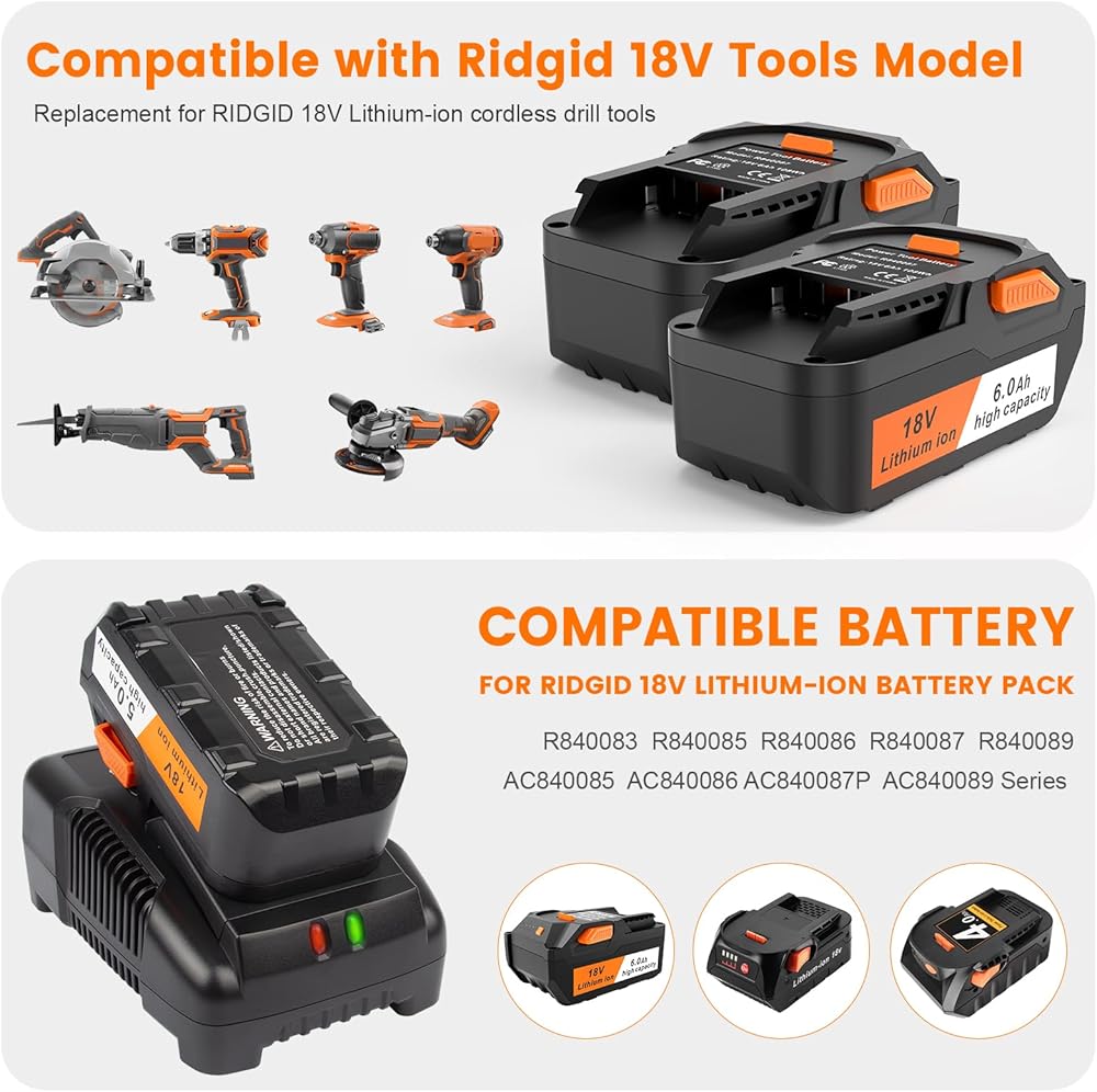 • متوافق تمامًا: سعة عالية 6.0 أمبير!!! بطارية ليثيوم احترافية لسلسلة Ridgid 18V ليثيوم R840087، R840083، R840085، R840086، AC840089، AC840085، AC840086، AC840087P