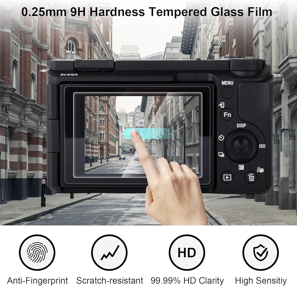 Equipped with tempered glass screen protector:The ZV-E10 II camera case includes two 9H hardness tempered glass screen protectors, which are explosion-proof and enhanced impact-resistant. The protectors are 99% transparent, ensuring high light transmittance for a clearer screen display. The included tool kit makes installation simple.