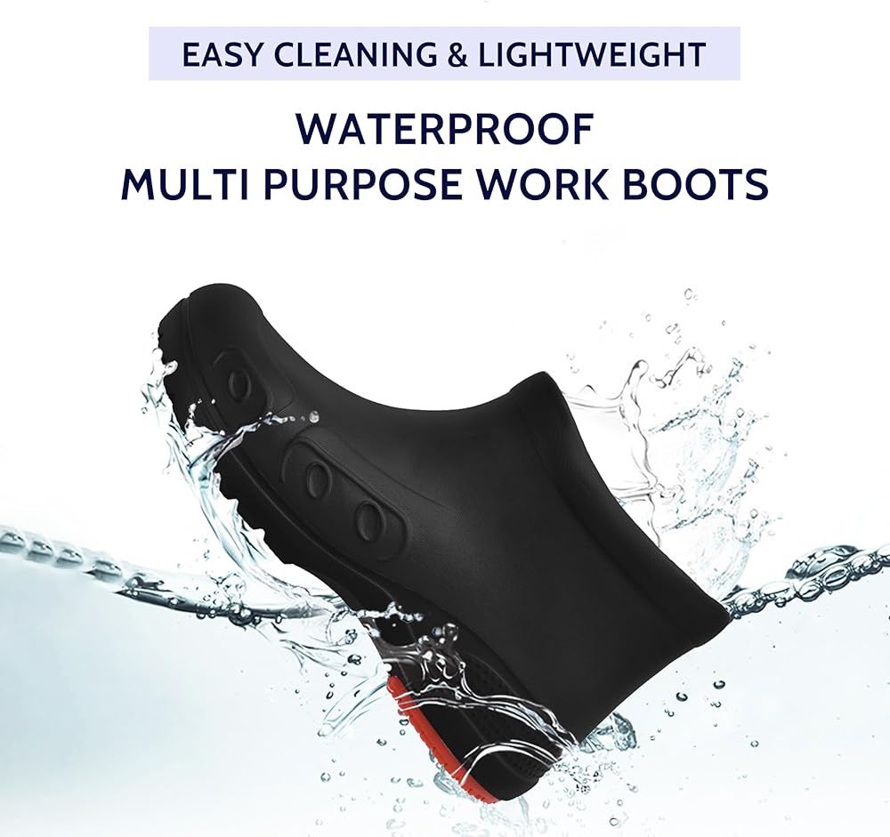 ثقة فائقة في مقاومة الماء - تغلب على أي أرضية مبللة مع أحذية EVA خفيفة الوزن، مما يحافظ على قدميك جافة تمامًا حتى في الظروف المغمورة. مثالية لكل من واجبات المطبخ والمغامرات الممطرة.