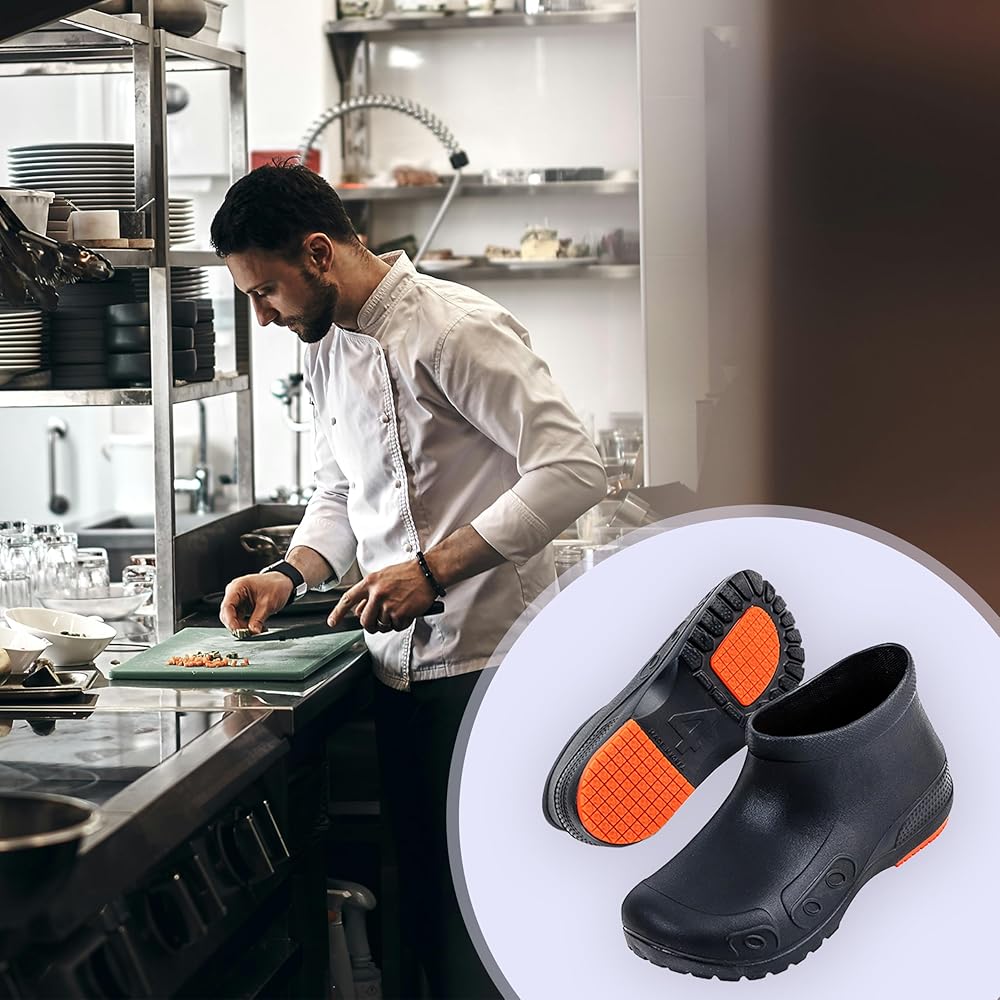 متين وآمن - مزيج مثالي من المطاط عالي الجودة وEVA (أسيتات فينيل الإيثيلين). لا تتشوه أحذية العمل المضادة للانزلاق بسهولة بسبب المواد الضارة وتحافظ على الثبات على الأسطح الزلقة، وهي مثالية للطهاة والبستانيين وممارسي الرعاية الصحية.