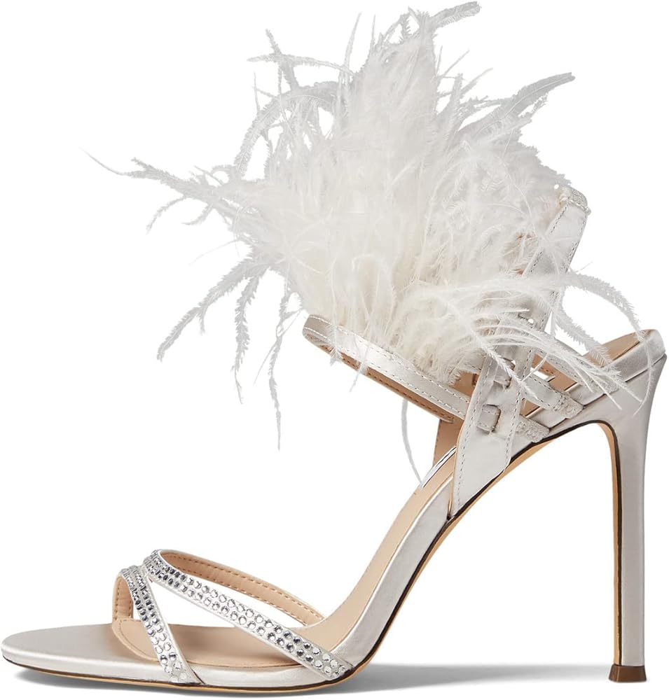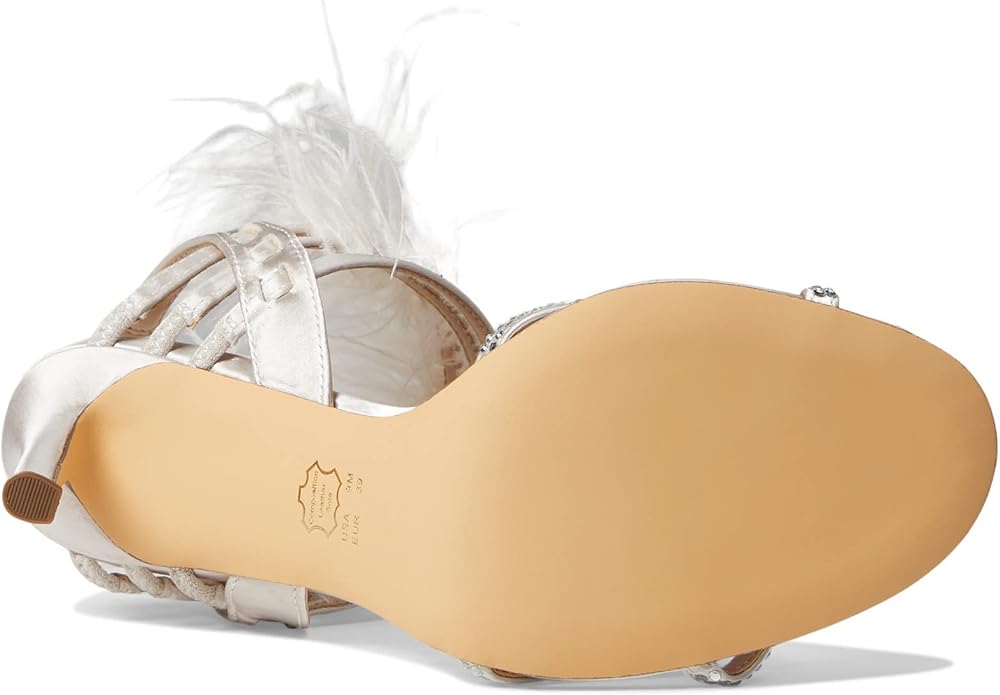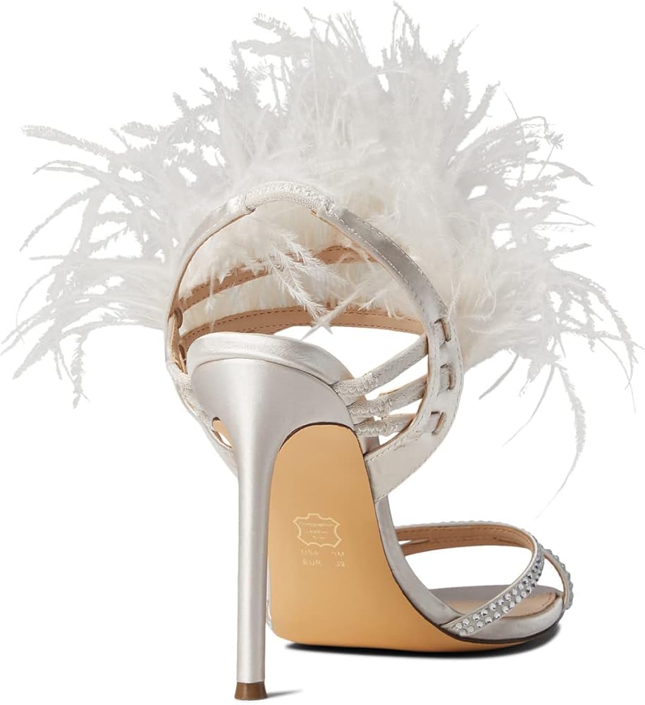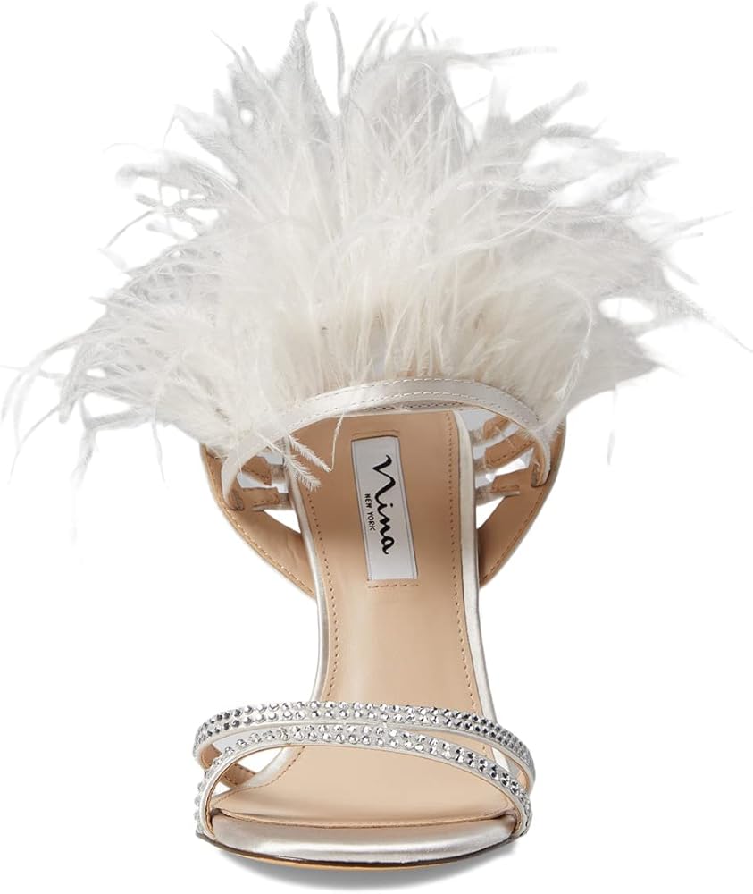 Make a statement in the fabulous and chic Nina Dalva heels with a faux feather cuff. Leather and textile upper. Leather lining and insole. Slip-on style. Strappy front and faux feather embellished ankle strap. Open, square toe construction. High heels. Leather outsole.