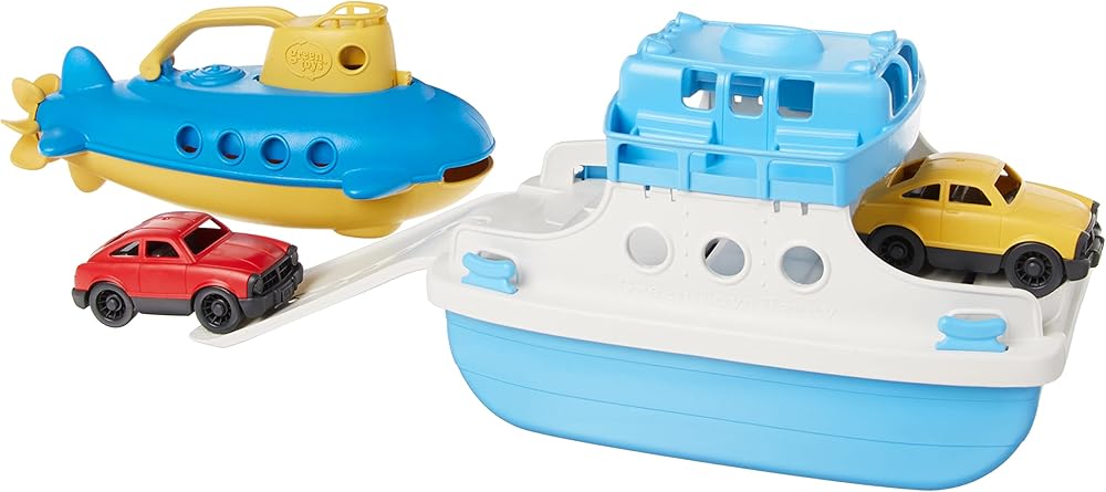 A new bath time bundle from Green Toys featuring two of our favorite water toys, Ferry Boat and Submarine. Set sail with the Green Toys™ Ferry Boat for a quick bathtub excursion or an extended trans-pool voyage. Whatever the adventure, this two-story vessel is ready to hit the open water with room for eco-friendly cargo galore, and even comes with two Green Toys™ Mini Fastbacks. Take the helm of the My First Green Toys™ Submarine for a nautical journey to help protect the planet! Submerge it underwater to explore the terrain at the bottom of the tub, and let it resurface to scan the horizon in search of the next earth-friendly adventure. Both toys are made in the USA from 100% recycled plastic milk jugs that save energy and reduce greenhouse gas emissions.