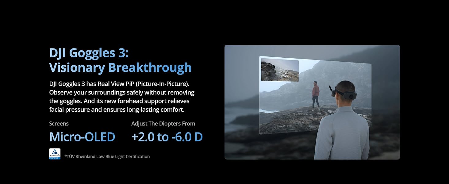 نظارات DJI 3: تتميز نظارات DJI Goggles 3 برؤية حقيقية PiP (صورة داخل صورة). مراقبة محيطك بأمان دون إزالة النظارات. كما أن دعم الجبين الجديد يخفف ضغط الوجه ويضمن راحة طويلة الأمد.
