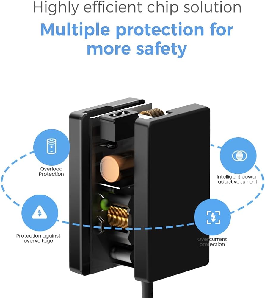 السلامة المعتمدة: الشاحن الخاص بنا معتمد من UL/CE/FCC/RoHS ومصمم بحماية OVP وOCP وSCP لضمان الأداء الفائق والموثوقية والسلامة. تحمي هذه الآليات من الجهد الزائد والتيار الزائد وقصر الدائرة الكهربائية، مما يضمن سلامة جهازك ضد تقلبات الطاقة.