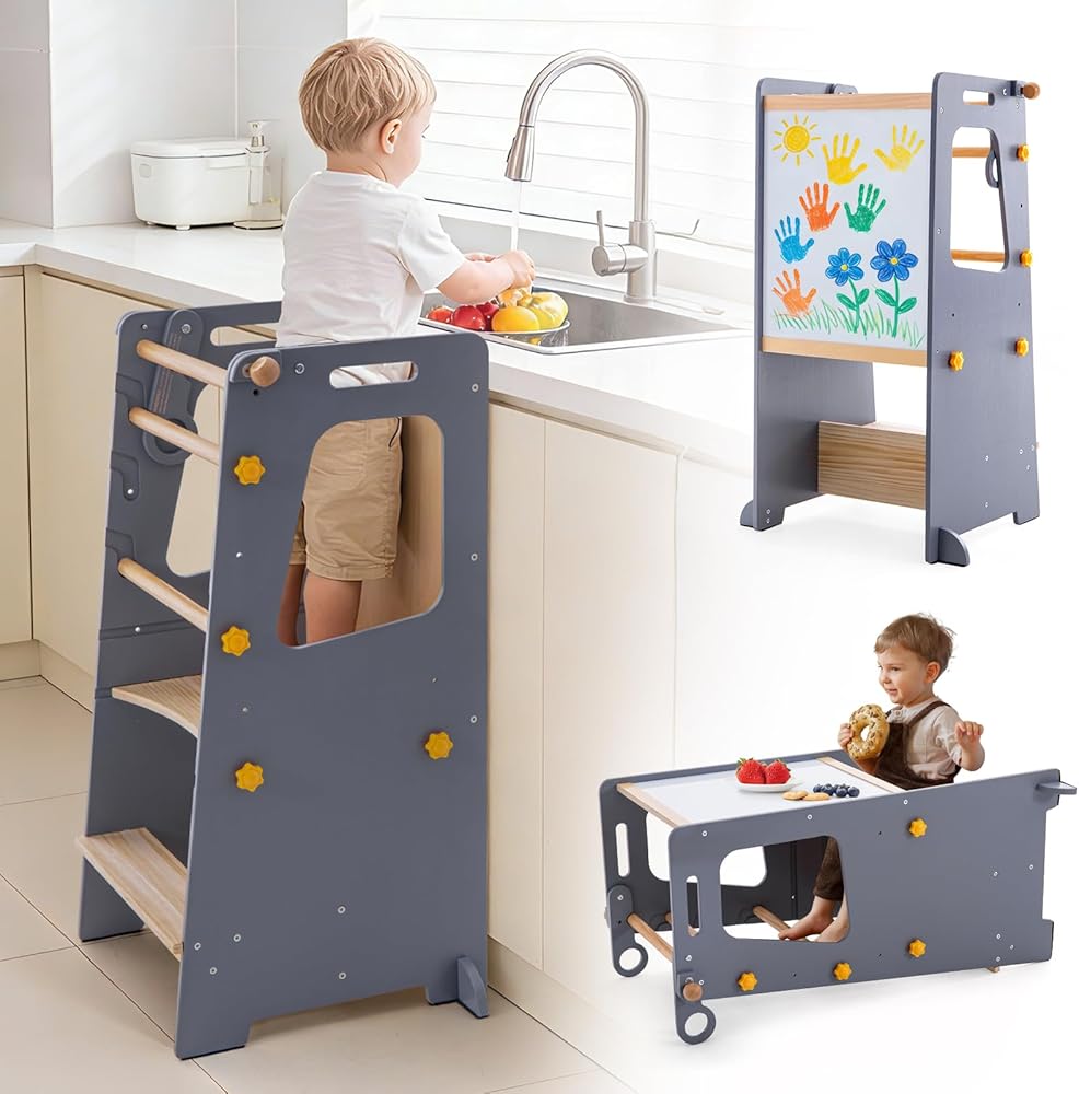 【MULTI-FUN】: 1.Toddlers can complete the bathroom wash through the toddler kitchen stool, kitchen help like making a dessert with parents, etc; 2.The Kitchen stool helper quickly converts to a toddler table and chairs without any tools, let your baby eat independently;3.The toddler standing tower also doubles as a learning wooden tower and chalkboard for learning and drawing, adding a little fun to the baby's development