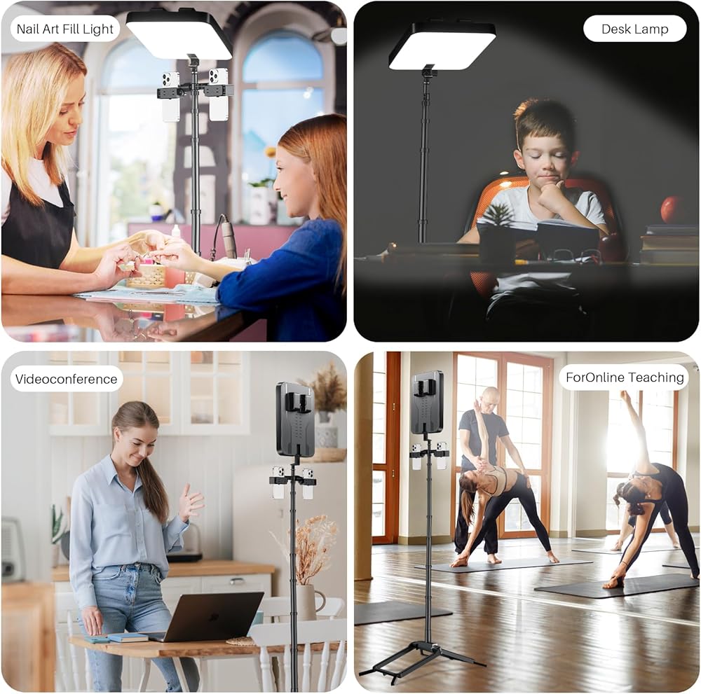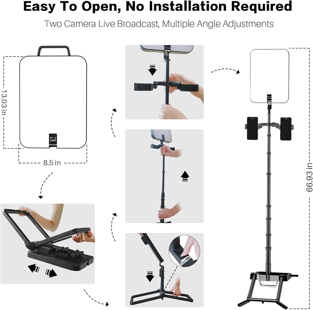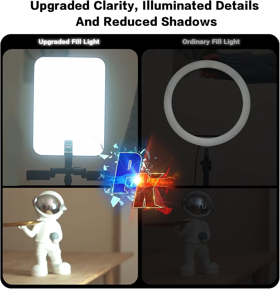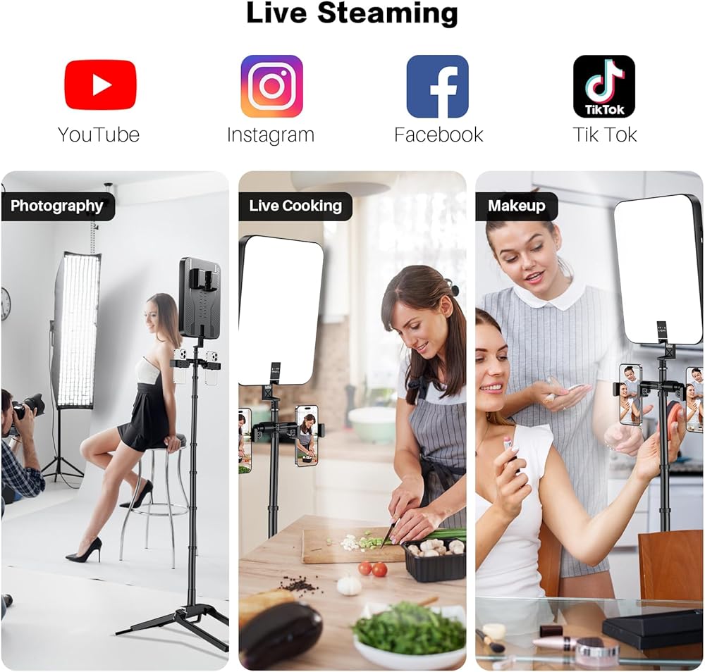 3.14-inch Full Screen Light Panel: Compared with the ring fill light of the same size, the light emitting area is five times larger. The light above the phone of the ring fill light is usually blocked by the phone, while shadows appear below the phone. The 14-inch full-screen fill light is more professional and provides sufficient light. And the dual mobile phones are located under the fill light. Supports horizontal and vertical live broadcast, the light will not be blocked, and there will be no shadows in the photos.