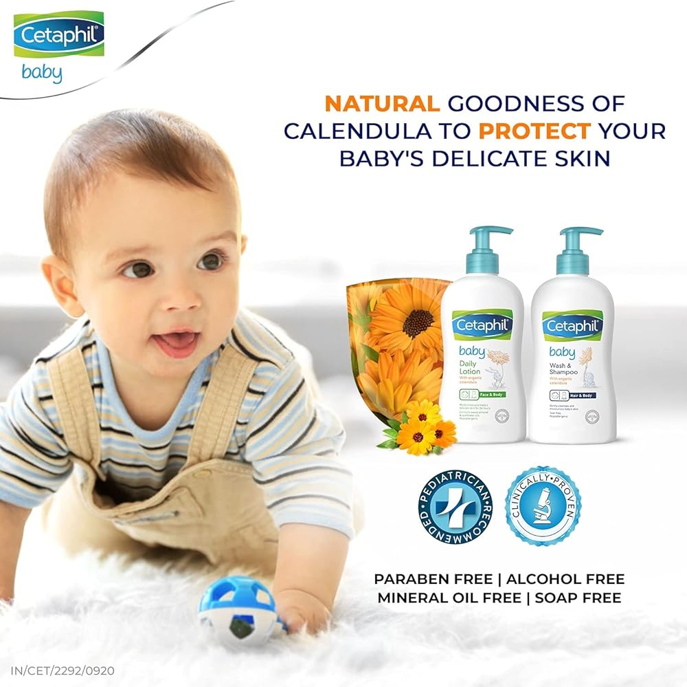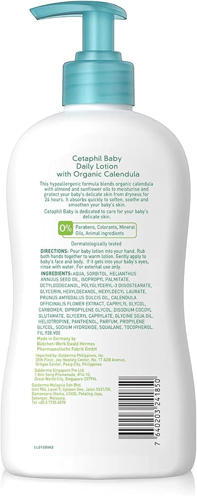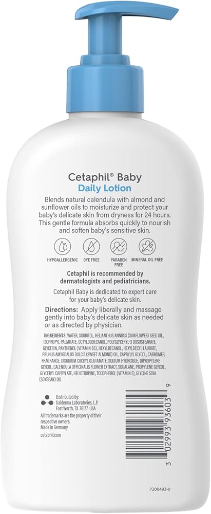 From the gentle skincare experts comes CETAPHIL Baby Daily Lotion, specially designed and tested by dermatologists to be gentle on baby sensitive skin. It is made with a blend of soothing calendula extract derived from the marigold flower, sweet almond oil and sunflower seed oil to keep skin soft, smooth and hydrated. As with all CETAPHIL Baby products, CETAPHIL Baby Daily Lotion contains NO parabens, colorants or mineral oil. It is hypoallergenic, gentle enough to moisturize and protect even the most delicate skin from dryness, and safe for everyday use.