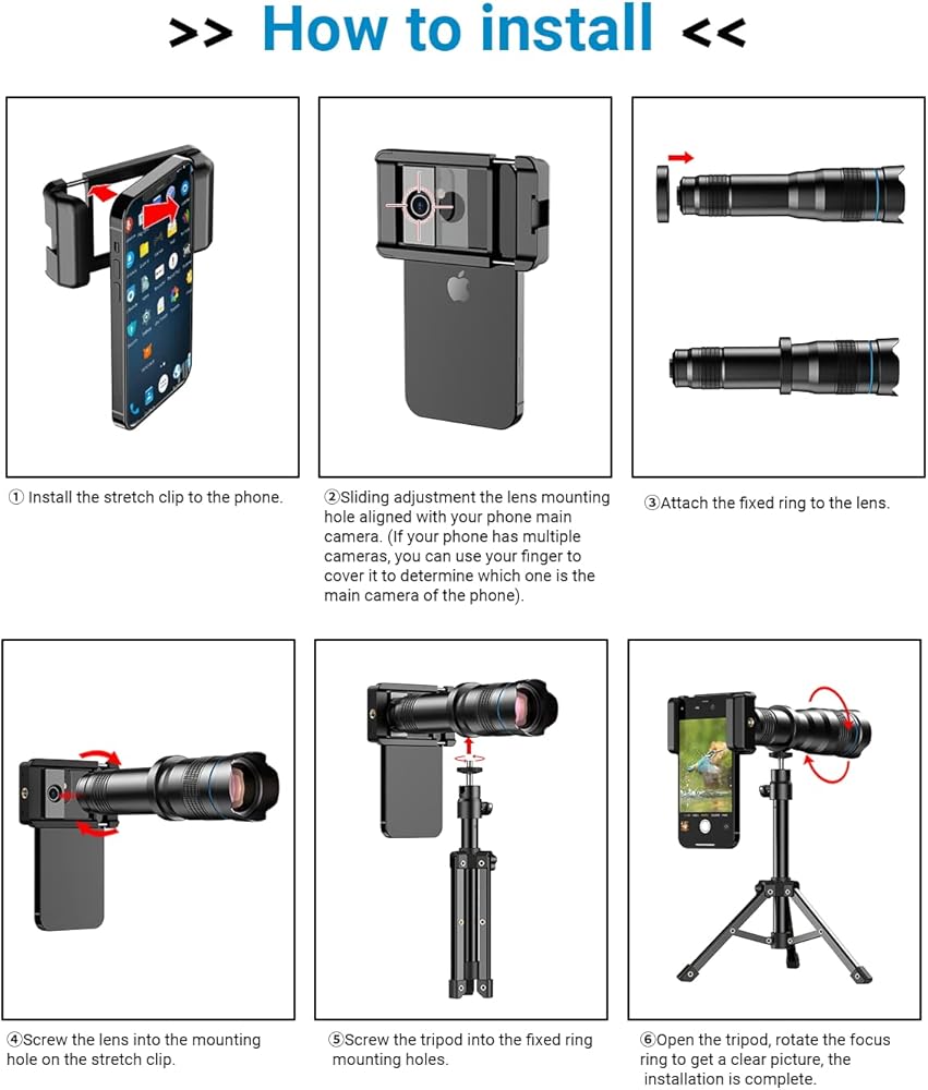 【عدسة هاتف قابلة للتعديل 36X تليفوتوغرافي 】: يمكن تعديل الطول البؤري لعدسة الهاتف المقربة عالية الطاقة 36X التي تمت ترقيتها حديثًا عن طريق تدوير حلقة التركيز، مما يجعل من السهل التقاط صور واضحة للأشياء على بعد أميال. ويمكن استخدامه أيضًا كتلسكوب أحادي بسيط لمراقبة المناظر الطبيعية والأشياء البعيدة، وهو رفيق لا غنى عنه لعشاق الصيد في الهواء الطلق ومصوري السفر في الهواء الطلق.