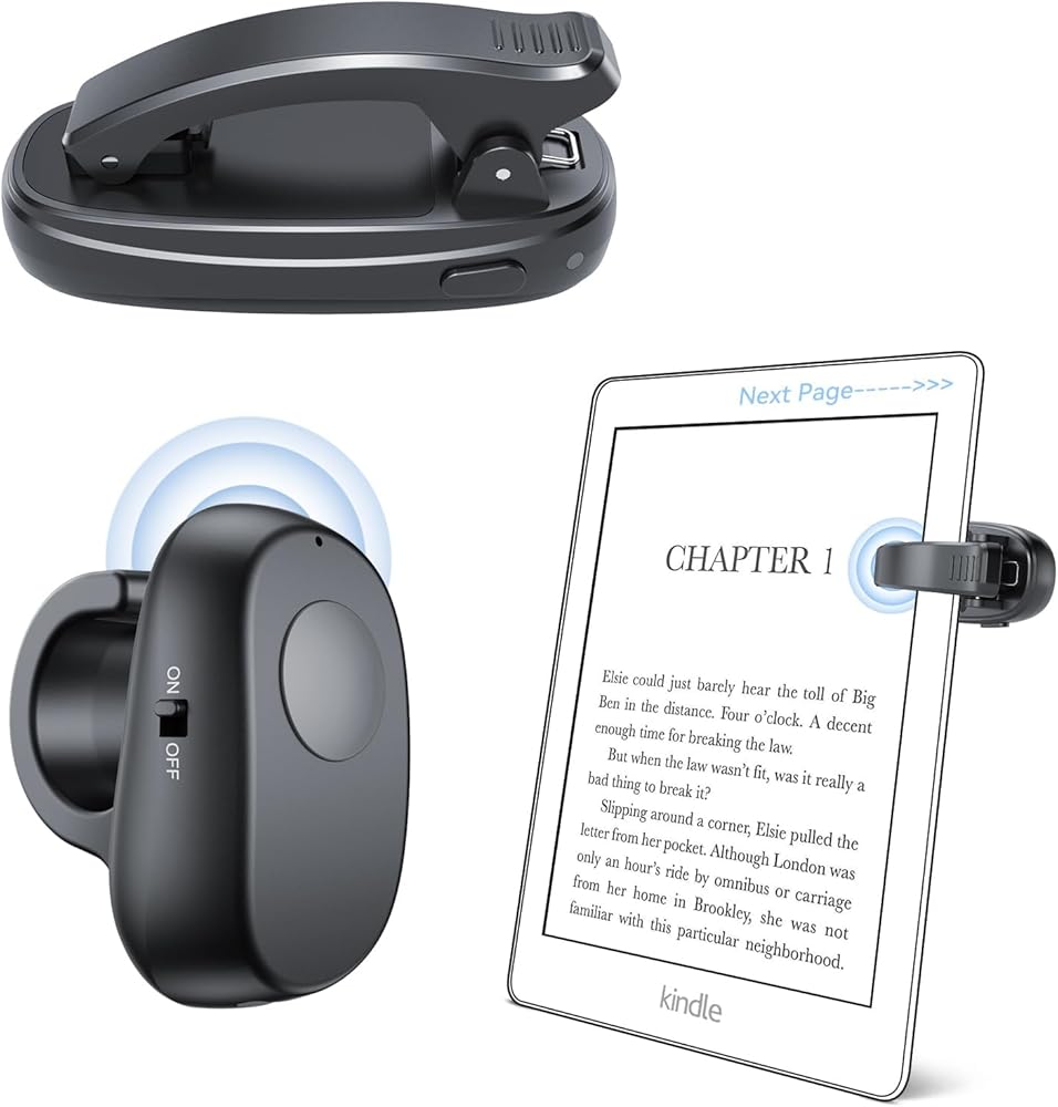 سهل الاستخدام: قم بالاقتران في ثوانٍ - اضغط على الزر الموجود على المشبك وجهاز التحكم عن بعد Kindle. تقليب الصفحة لاسلكيًا دون النقر على الشاشة. (المقطع الأيمن: الصفحة التالية. المقطع الأيسر: الصفحة السابقة.)