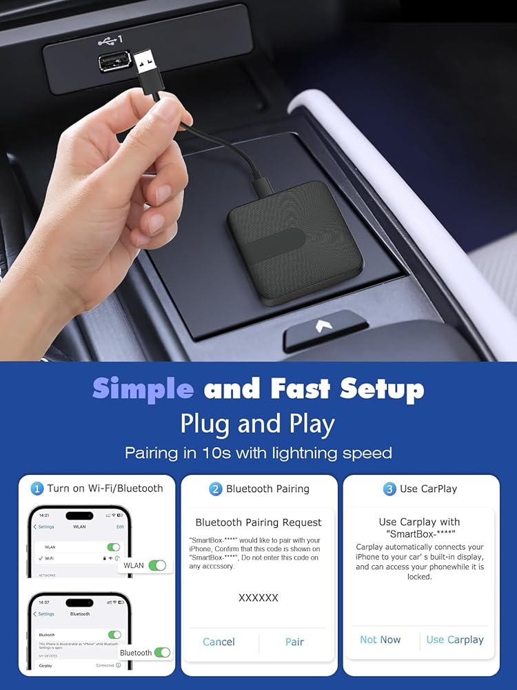 • اتصال ثابت وسريع لا تشوبه شائبة: توصيل وتشغيل بسيط، اتصال غير حثي، سوف يتصل محول CarPlay اللاسلكي الخاص بنا بسلاسة مع CarPlay بعد الإعداد الأول، ويعمل مع Wifi 2.4 جيجا هرتز + 5.8 جيجا هرتز يوفر سرعة نقل بيانات سريعة ووقت استجابة منخفض