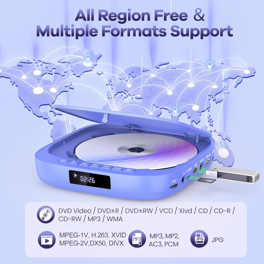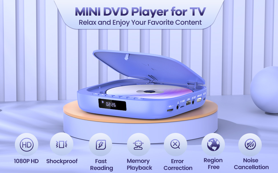 • 【مشغل DVD مجاني لجميع المناطق】يدعم مشغل DVD الصغير تشغيل أقراص DVD من مناطق مختلفة. تنسيق الدعم: CD، DVD، DVD-R/+R، DVD-/+RW، CD-R/-RW، VCD، SVCD، الأقراص المسجلة بواسطة مسجل DVD. أقراص Blu-ray غير مدعومة!