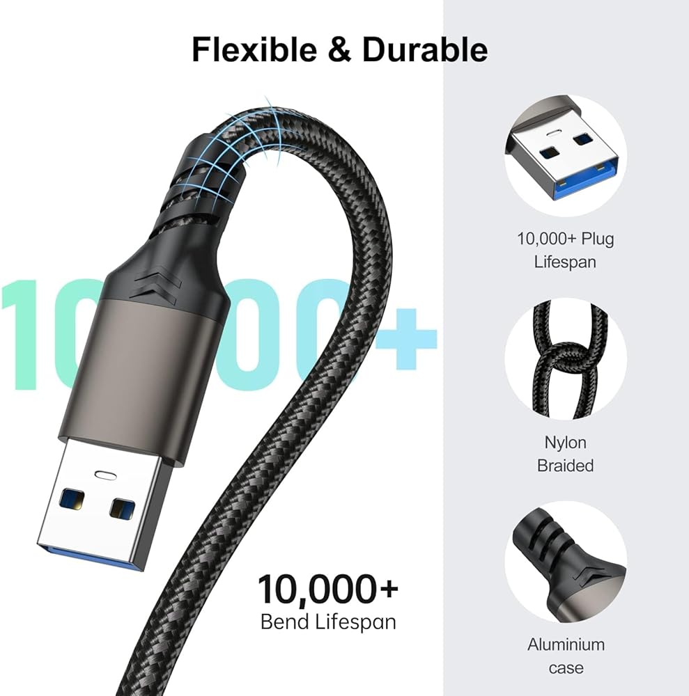 【Sturdy & Durable】USB A to A Cable is made of the nylon braided material as the climbing rope, which is making the cable more flexible and wear-resistant. Pass 10000 bending tests, The aluminum alloy shell is resistant to corrosion and oxidation and has better heat dissipation performance.
