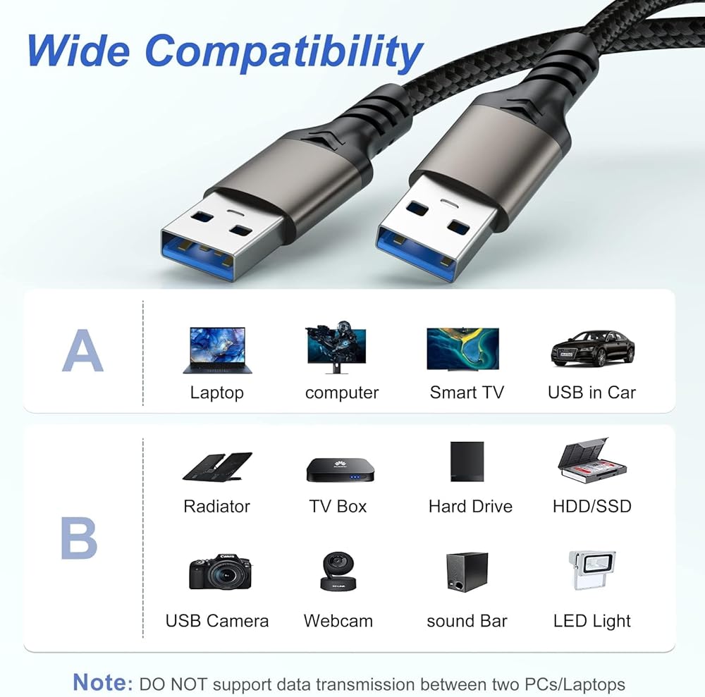 【Wide Compatibility】This USB 3.0 male to male cable compatible with Windows PC desktop, External Hard Drive, Laptop Cooling Pad, DVD player, USB 3.0 hub, Monitor, Camera, Wacom, Set-Top Box, Blue-ray Drive, Car Bluetooth Speaker, 2.5-Inch External Hard Drive Enclosure.