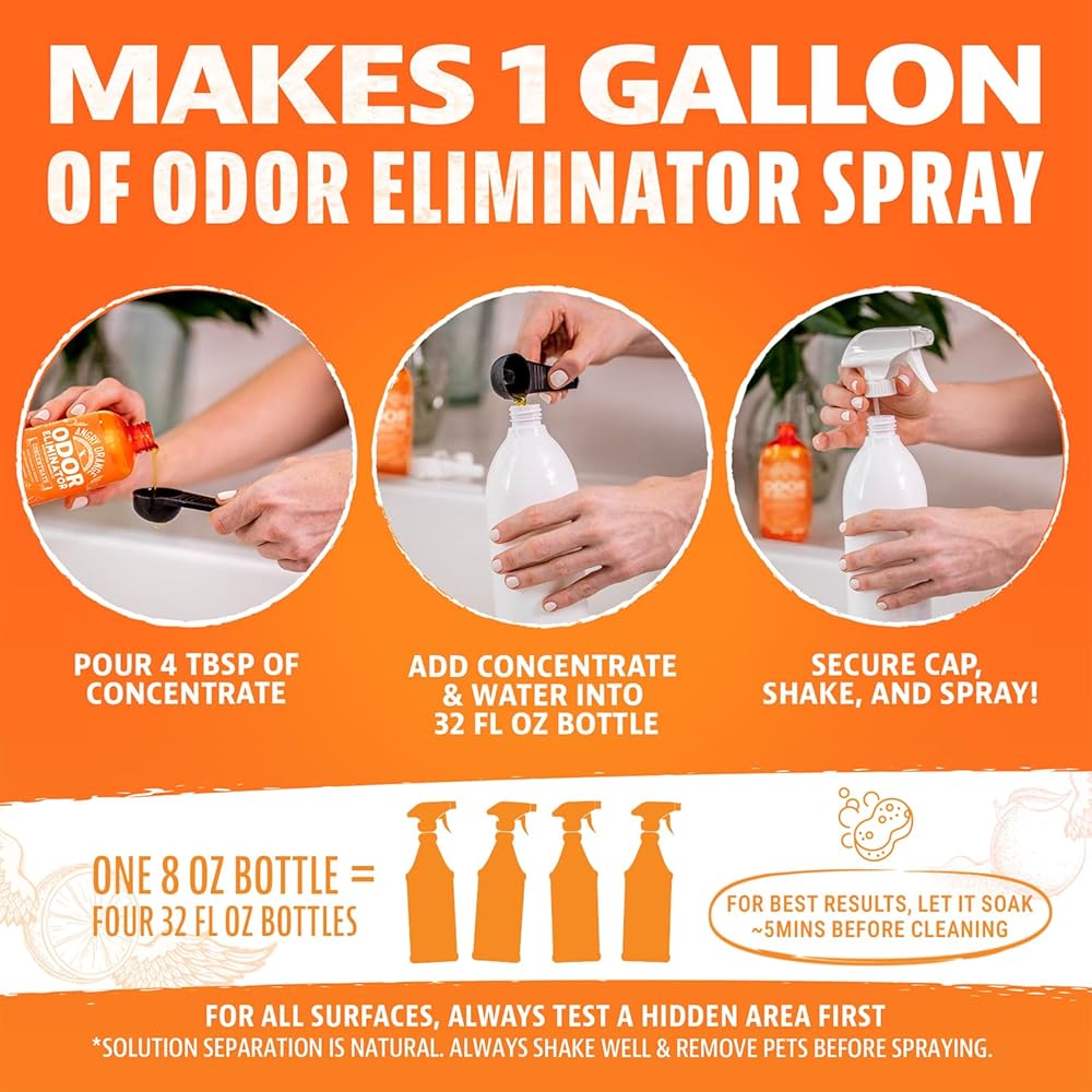 • منظف ​​مركّز: ما عليك سوى إضافة 4 ملاعق كبيرة من مزيل رائحة البول هذا إلى زجاجة ماء سعة 32 أونصة - ثق بنا، هذا كل ما ستحتاج إليه. بعد ذلك، فقط قم برجه ورشه حتى يرضي قلبك. خيار مستدام لمزيل الرائحة!