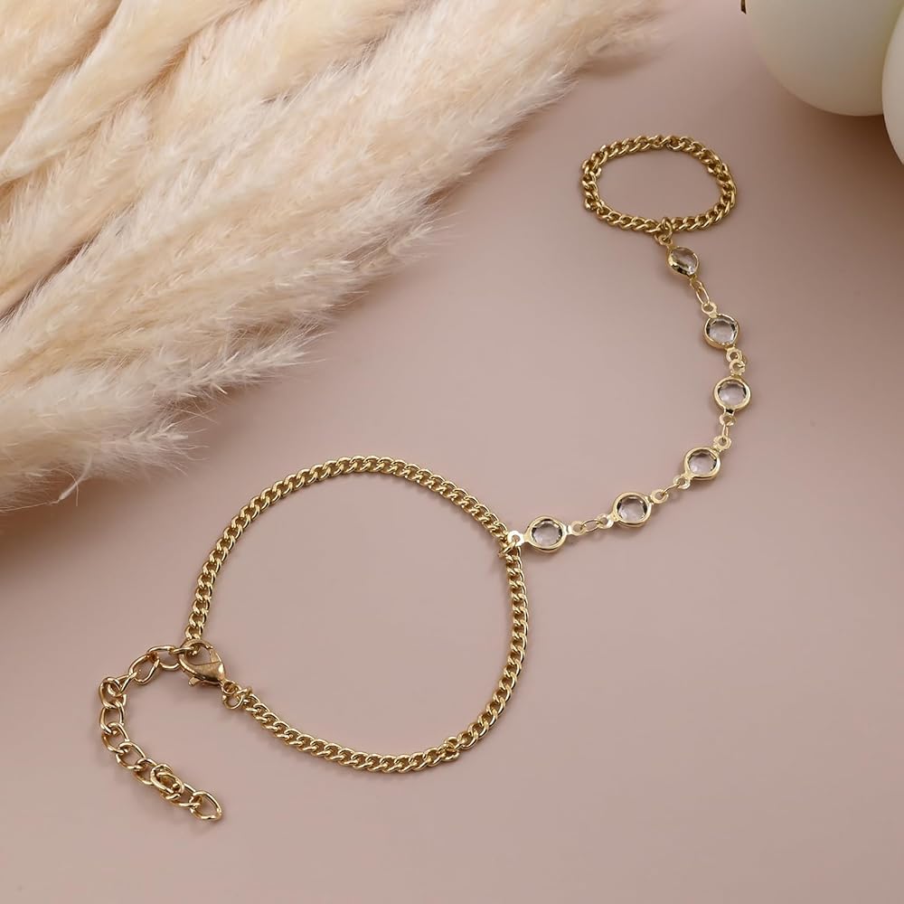 Gold Hand Chain Bracelet with CZ Ring Bracelet Hand Chain for Women Adjustable Finger Ring Bracelet for Gift