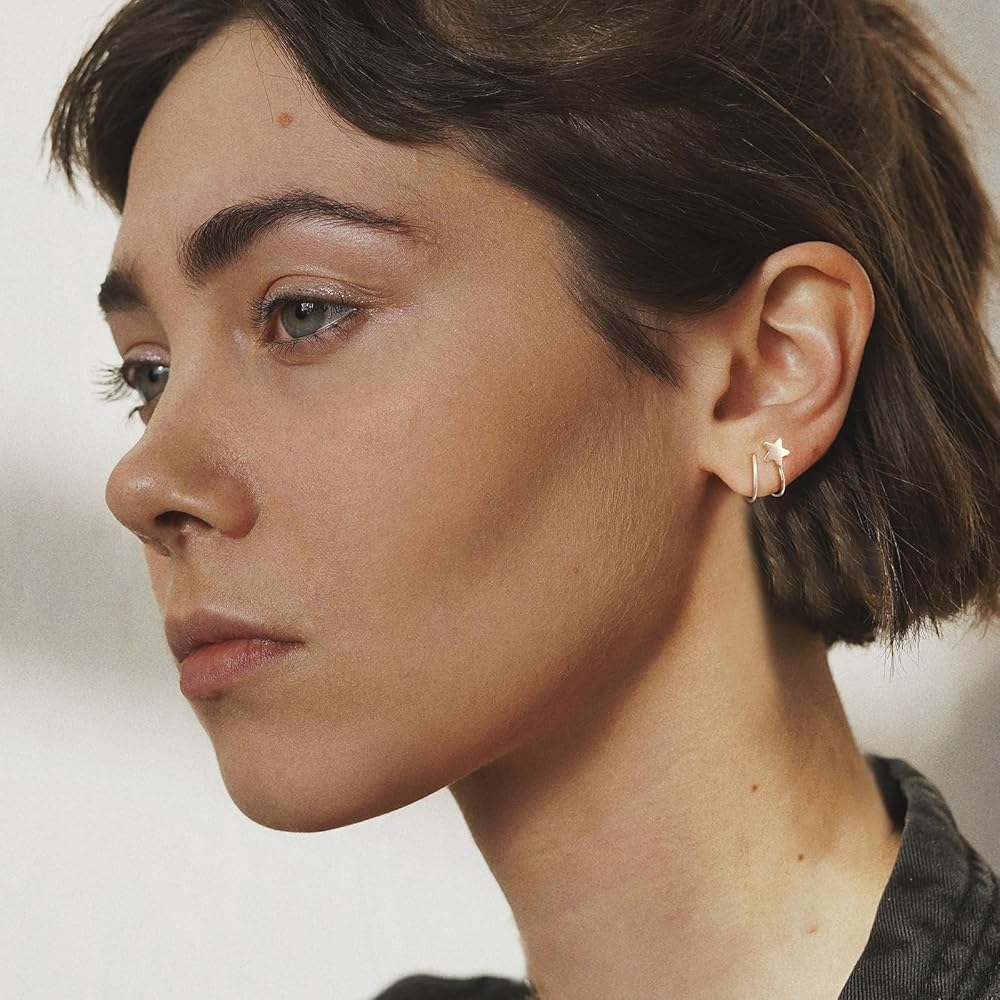 [Double Hoop Earrings] This small twist hoop earrings design is simple, with simple lines twisted to create a feeling of wearing two earrings. A small star is added at the earrings, playful and cute. Both one and two ear holes can be worn, making it fashionable and versatile.