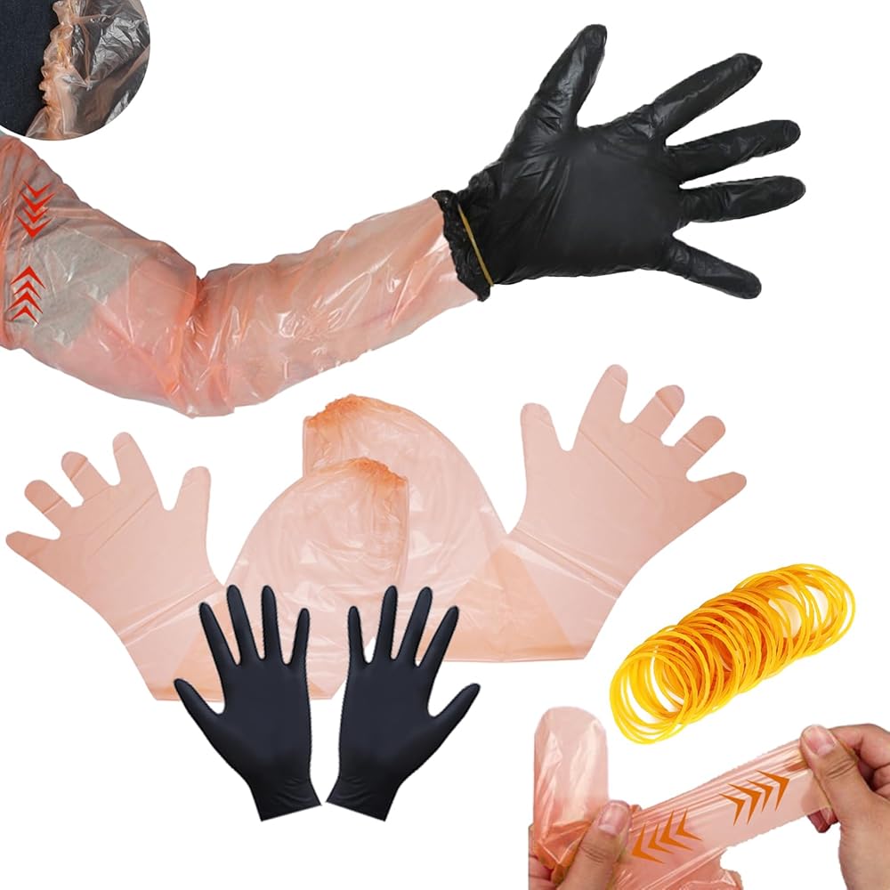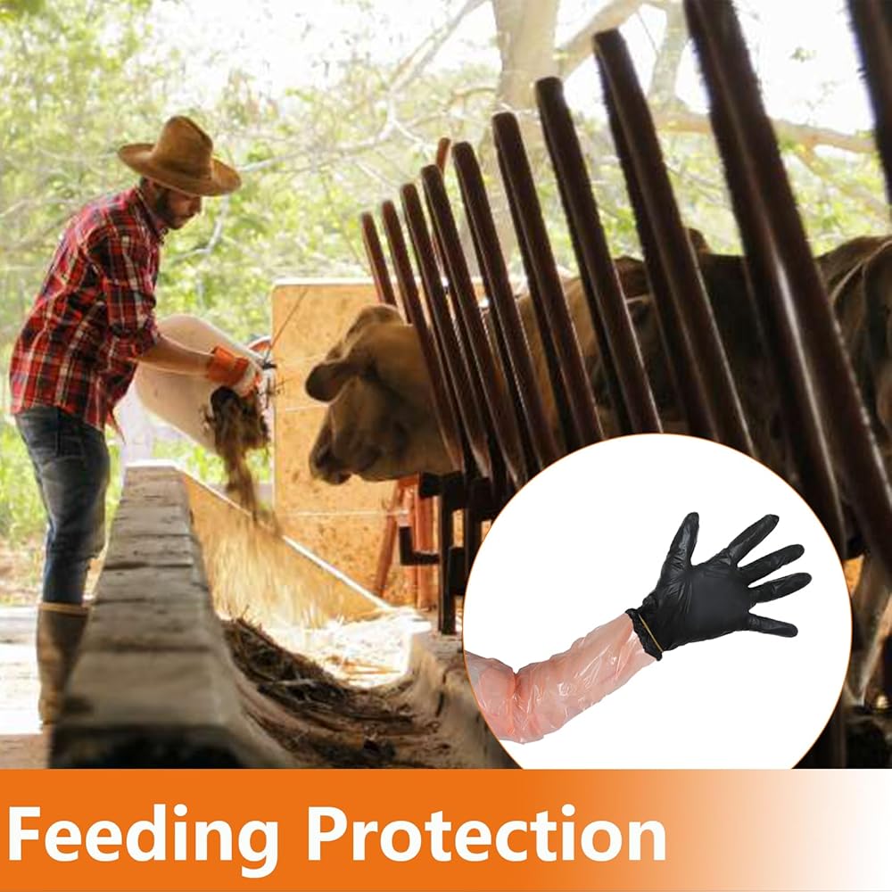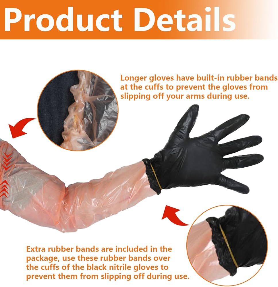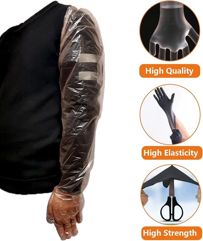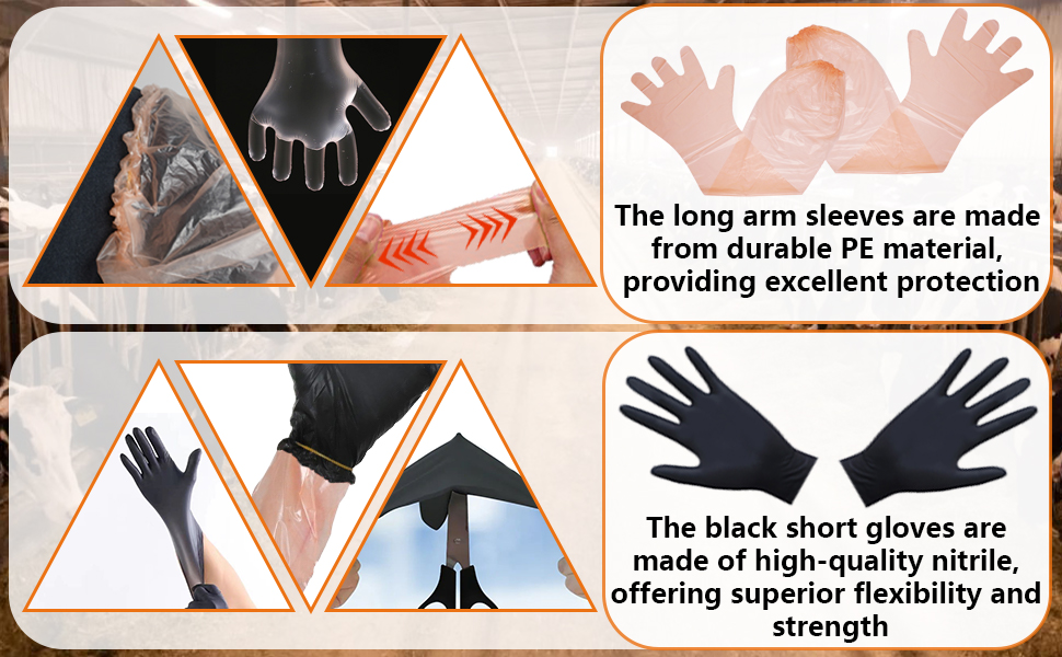 مواد فاخرة: أكمام الذراع الطويلة مصنوعة من مادة البولي إيثيلين المتينة، مما يوفر حماية ممتازة، بينما القفازات السوداء القصيرة مصنوعة من النتريل عالي الجودة، مما يوفر مرونة وقوة فائقة.