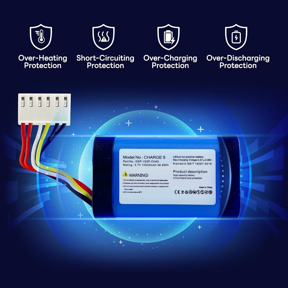 ✔️【رقاقة ترقية】ترقية جديدة لبطارية JBL Charge 5 مصنوعة من بطاريات عالية الجودة من الفئة A وحاصلة على شهادات CE وFCC وUL وPSE وROHS. رقاقة مدمجة لمنع الشحن الزائد والتفريغ الزائد والسخونة الزائدة.