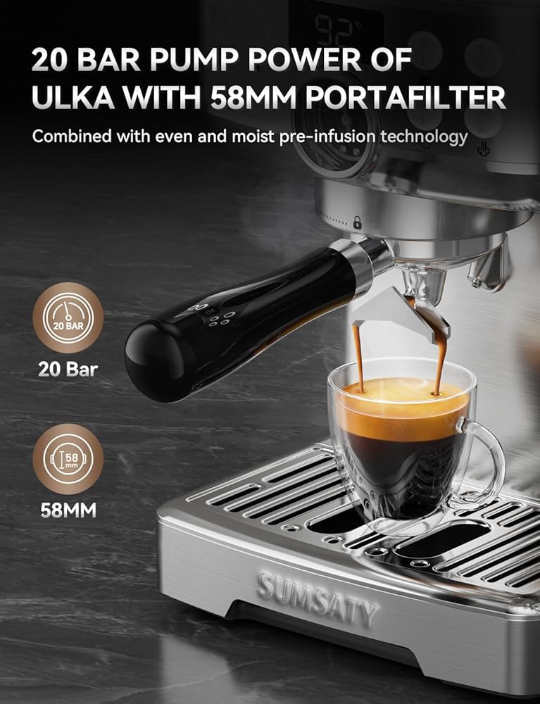 مضخة أولكا الاحترافية: ماكينة الإسبريسو هذه مجهزة بمضخة عالية الأداء بقوة 20 بار، جنبًا إلى جنب مع تقنية التسريب المسبق المتساوي والرطب، مما يضمن الاستخلاص الكامل لكريمة القهوة. مع بدء التشغيل السريع، يمكنك الاستمتاع برائحة القهوة الغنية بسرعة ودون عناء.