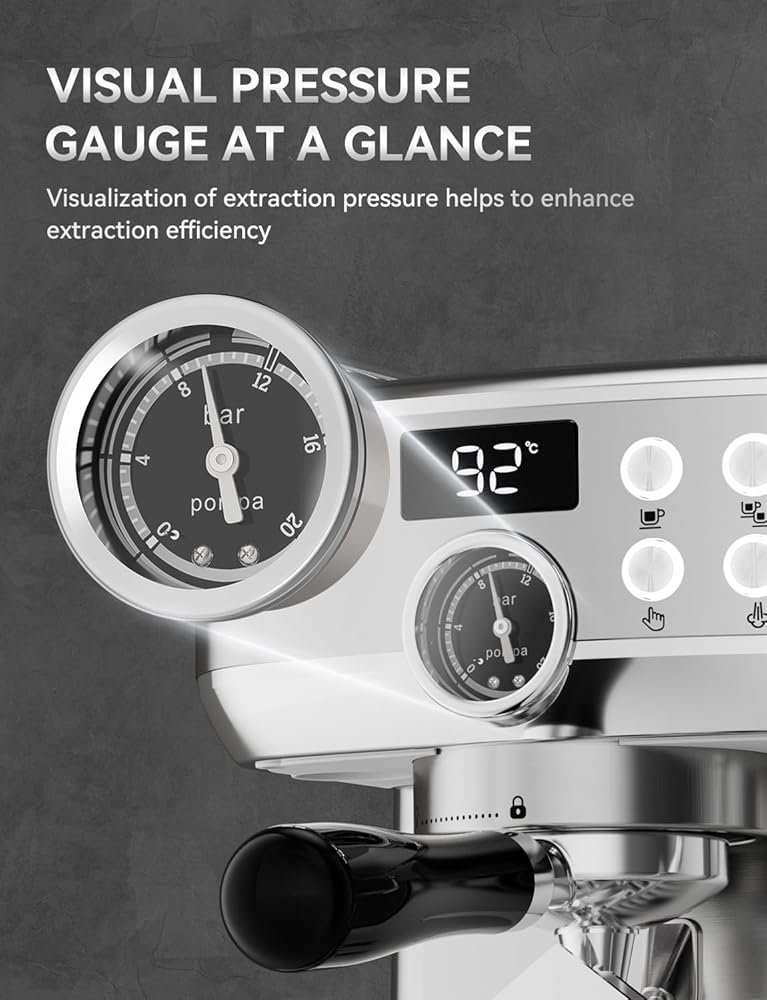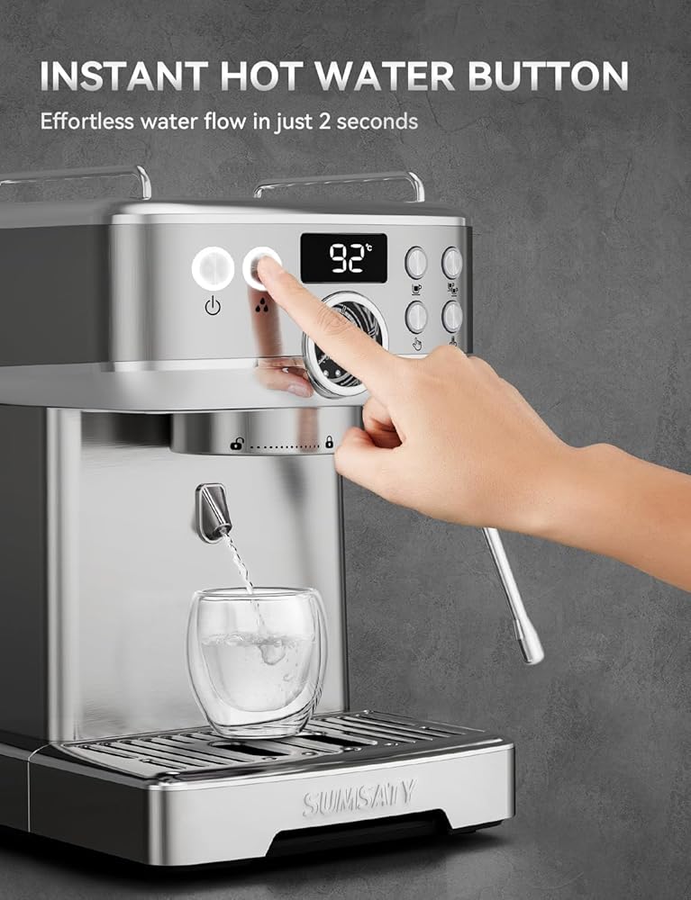 التحكم في درجة الحرارة PID: تم تجهيز ماكينات القهوة لدينا بعنصر عالي الطاقة 1450 واط، مما يضمن عصا بخار عالية الضغط لتسخين أسرع وإنشاء رغوة حليب غنية دون عناء. بفضل ميزة الدوران بزاوية 270 درجة، لديك تحكم كامل في عملية تكوين الرغوة، مما يتيح لك تحقيق الملمس والاتساق المثاليين.