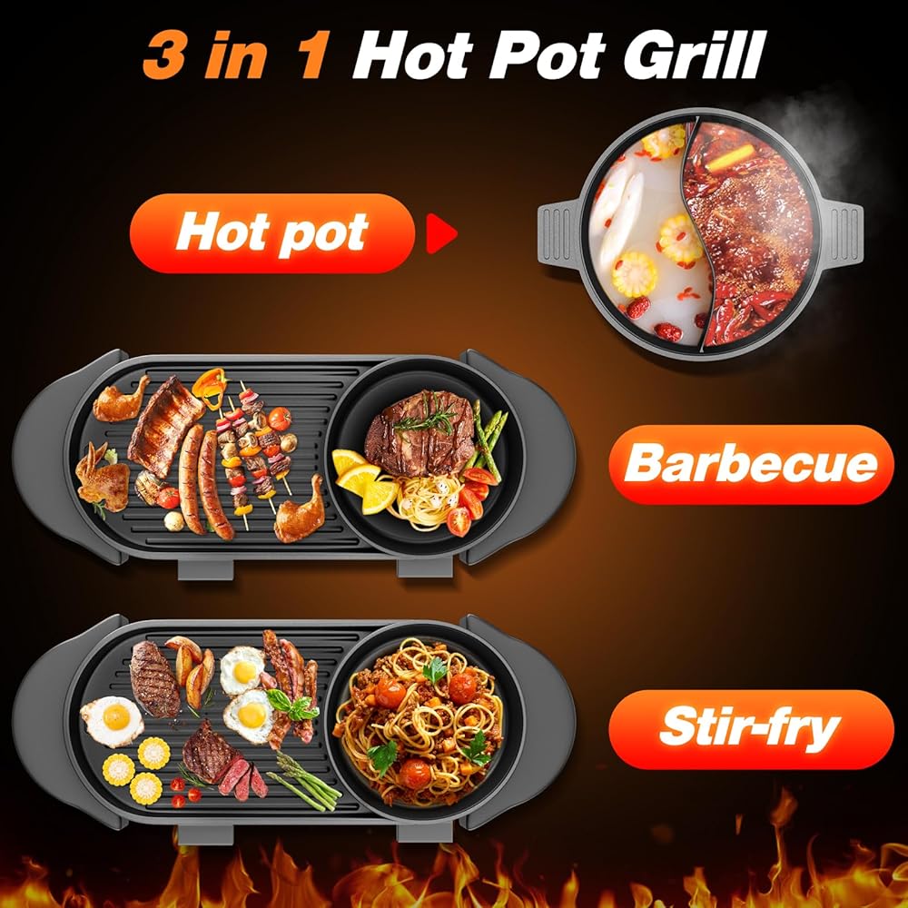 • وعاء ساخن متعدد الوظائف 3 في 1 مع شواية: يجمع وعاء التسخين الكهربائي الخاص بنا بين الشوي ومقلاة القلي السريع، مما يسمح لك بالاستمتاع بثلاثة أنماط للطهي من الطعام في نفس الوقت باستخدام وعاء طبخ واحد، والاستمتاع بمتعة الطبخ مع عائلتك. لديها نسبة أداء عالية التكلفة