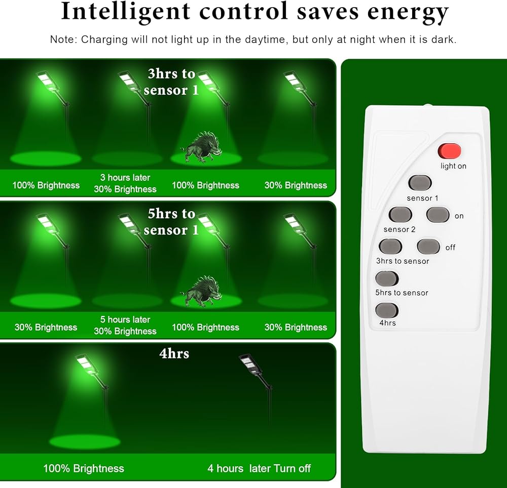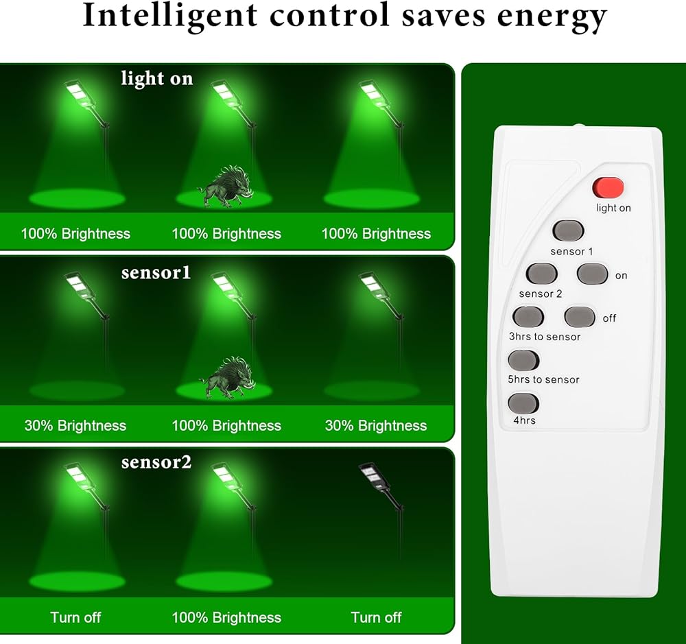 Motion Activated &Dusk To Dawn:Constantly light, motion sensor, brightness all can be customized by remote.With the upgrated smart controller, the green hog light can be totally TURN OFF or keep 30% brightness when no motion is detected. When the Hogs/Deers approaches, the light will automatically turn on 100% brightness .It have a longer working time