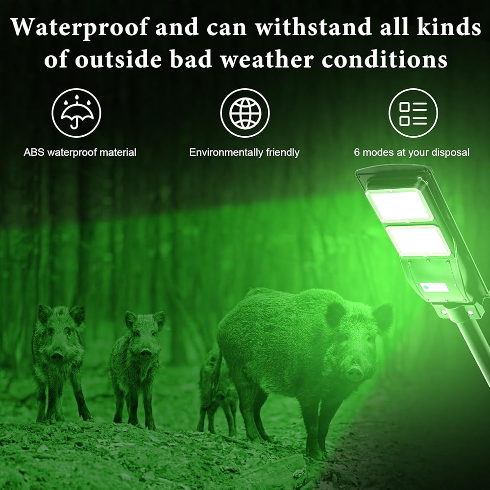 Solar Powered & No Electricty Bill:Green light for hunting solar panels convert solar energy into electricity.NO wires,easy to install,maintenance free.Solar Hog Light use large polysilicon panel, high conversion rate, After being fully charged(Charging time: 6-8H), which can be used continuously for 1-2 days with radar mode