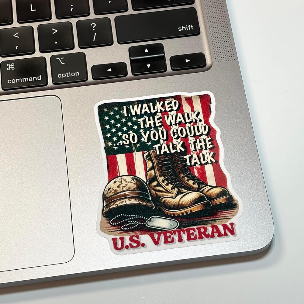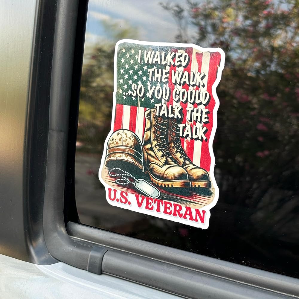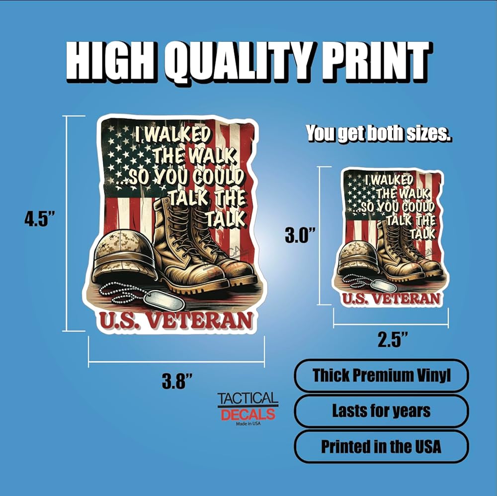 Tactical Decals - I Walked The Walk So You Could Talk The Talk stickers. These are a great way to show support, pride, and respect for our Veterans. These are perfect for any branch of USA Military - army, Navy, Airforce, or Marines. These are printed on high quality vinyl and UV laminated to add extra scratch, fade, and waterproof protection. Each order includes one 4.5" and one 3" Application is an easy peel and stick to any clean smooth surface.