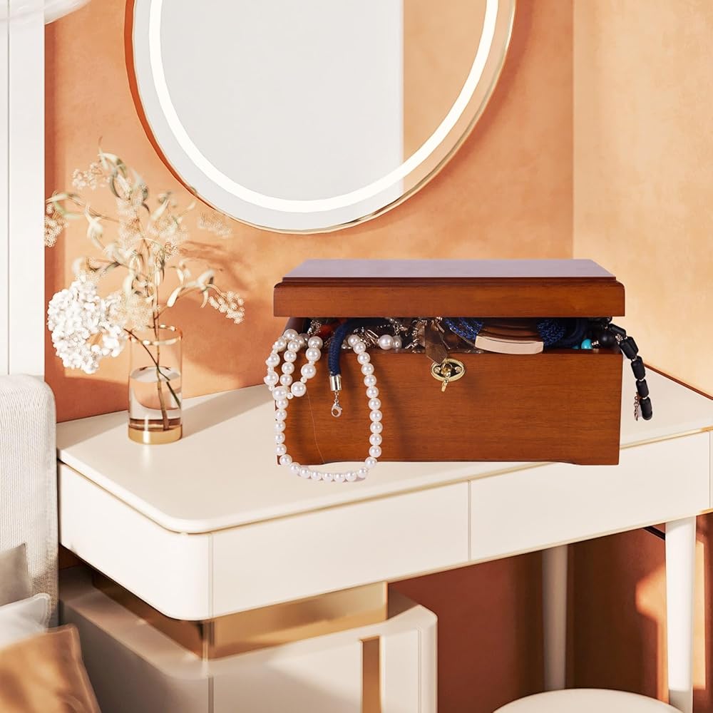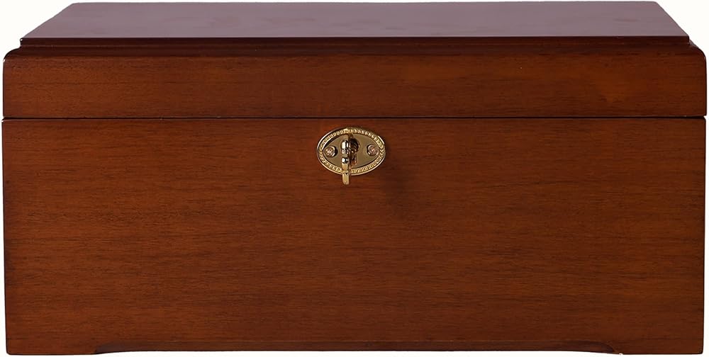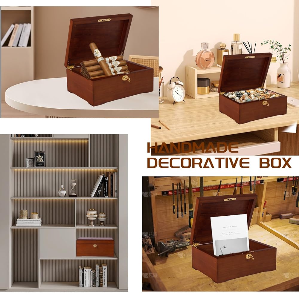 • الأمان ومساحة كبيرة: يحتوي الصندوق الخشبي على تصميم نظام قفل ومفتاح لحماية أغراضك الشخصية الثمينة، من المجوهرات إلى الحروف، ويمكن تخزين كل شيء بأمان. تضيف الصناديق الخشبية لمسة عصرية راقية إلى ديكور منزلك الداخلي. بالإضافة إلى ذلك، يأتي المفتاح مع حقيبة رائعة برباط للتخزين المريح.