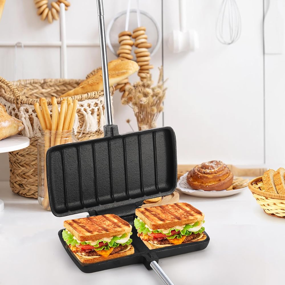 صانع الساندوتشات من حديد الفطيرة المزدوجة من كولوتش، صانع الساندوتشات من الحديد الزهر مع مقبض طويل صانع الفطائر المحمول، معدات الطبخ المحمولة للتخييم والساندويتش وصنع الفطائر