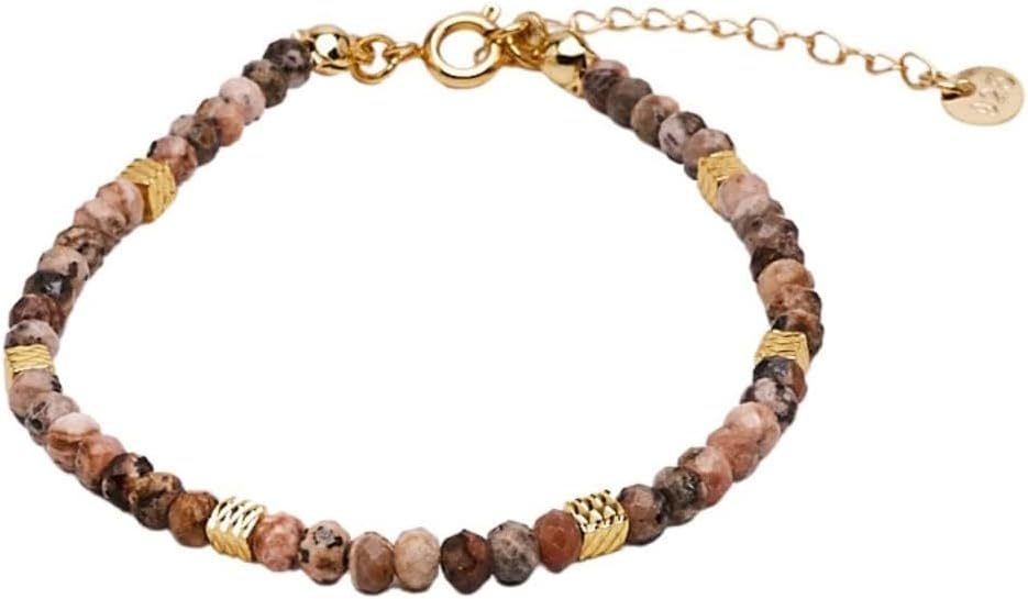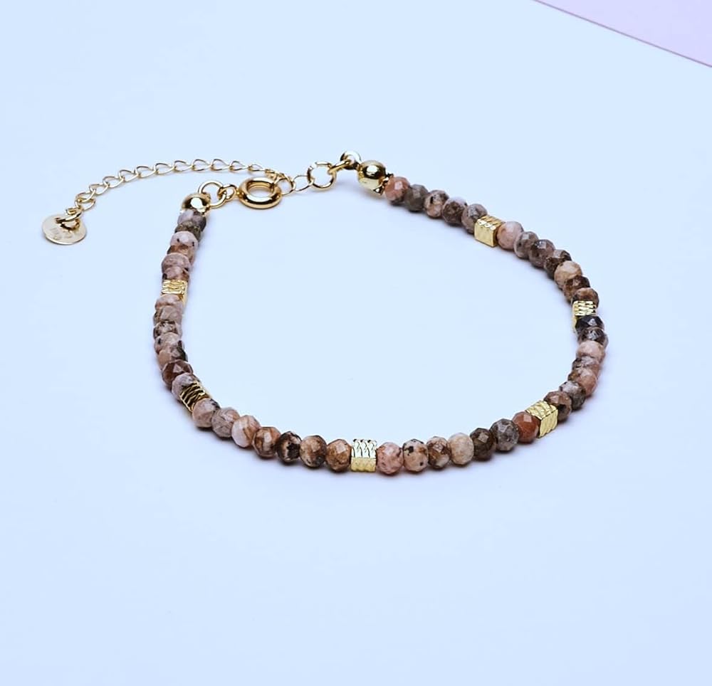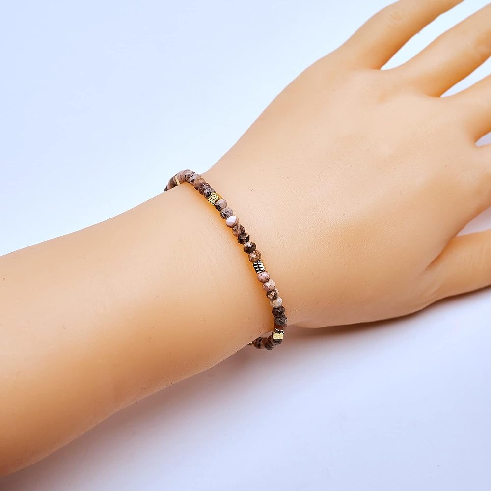 andmade natural gemstone stress and anxiety power bead healing bracelet for men and women. I have created this bracelet using 3X4mm faceted natural gemstone beads, 3mm gold plated space beads threaded on strong wire finished with spring clasp with 5cm extender. Bracelet Length approx: 16.5cm to 20cm. Small and delicate, You can wear this bracelet alone or layers up with other bracelets for the mordem look. Simple and stylish, it can goes with any outfit ! It makes the perfect gift for yourself or a loved one. Available in different stone: African pine, Amazon Stone , black line rhodolite and speckled stone for your choice.