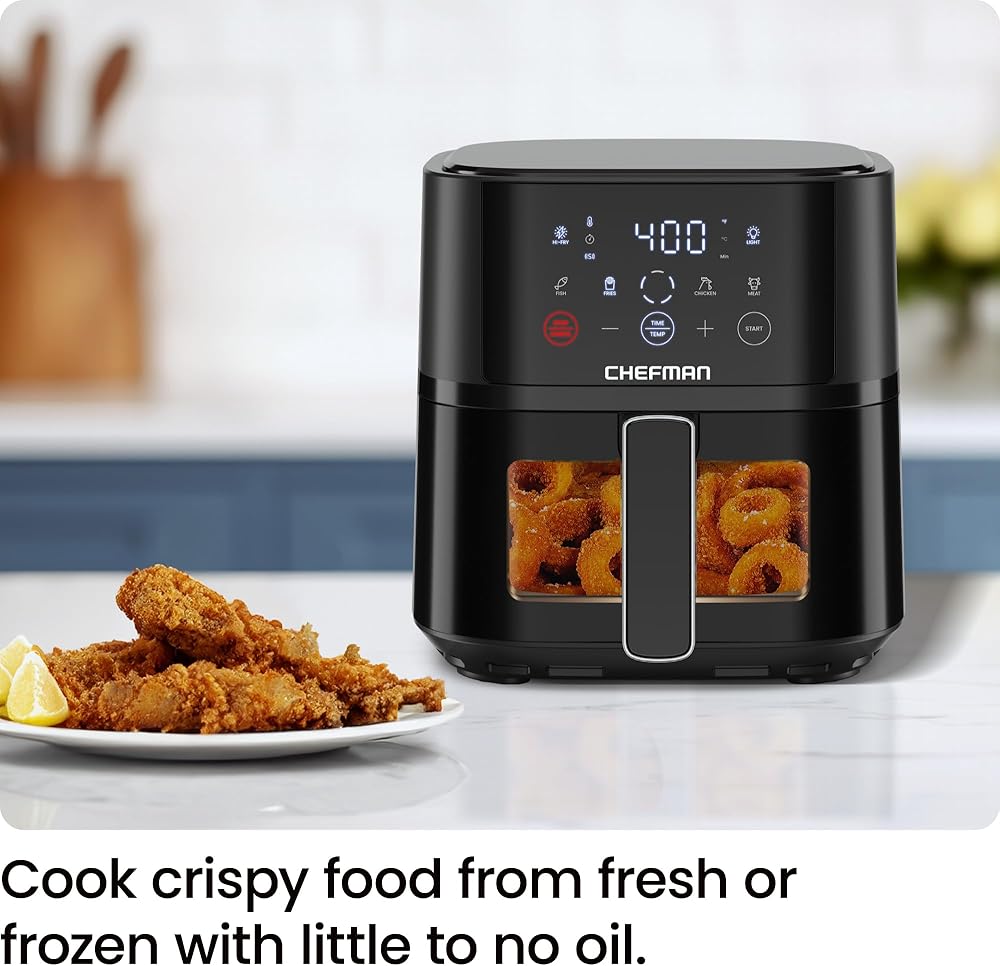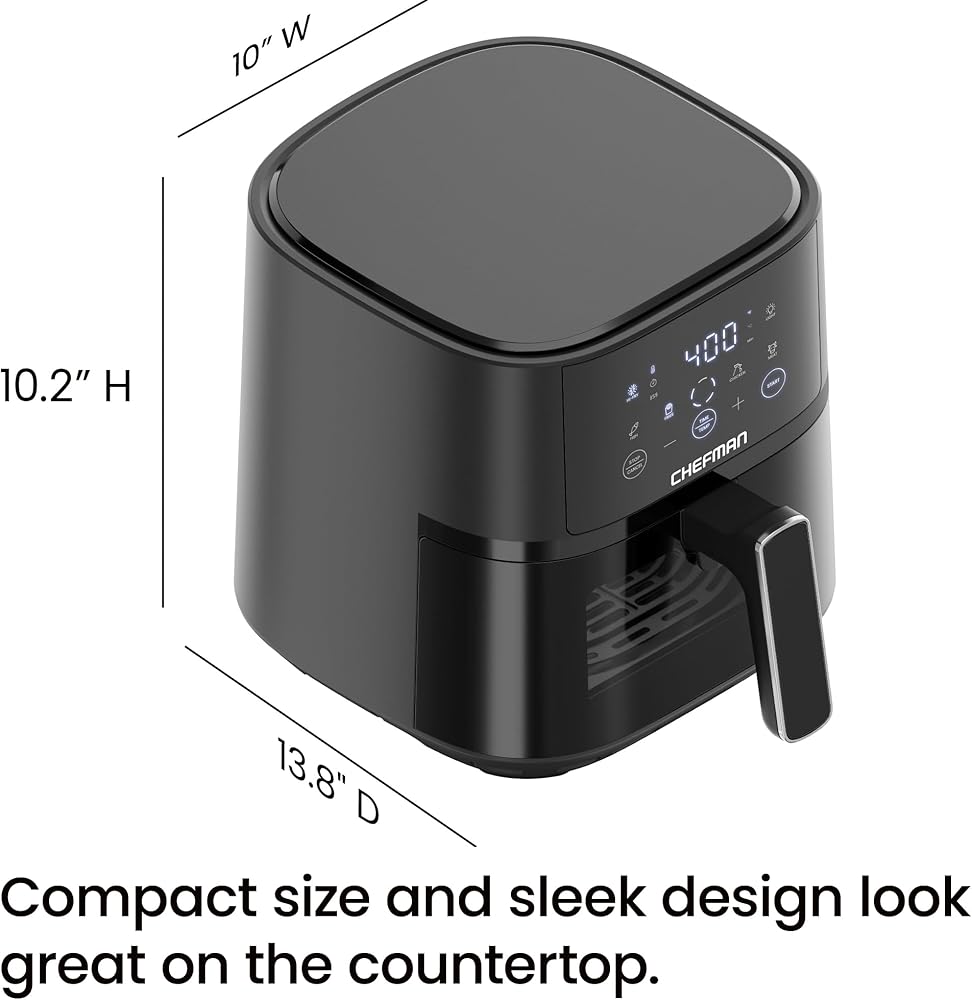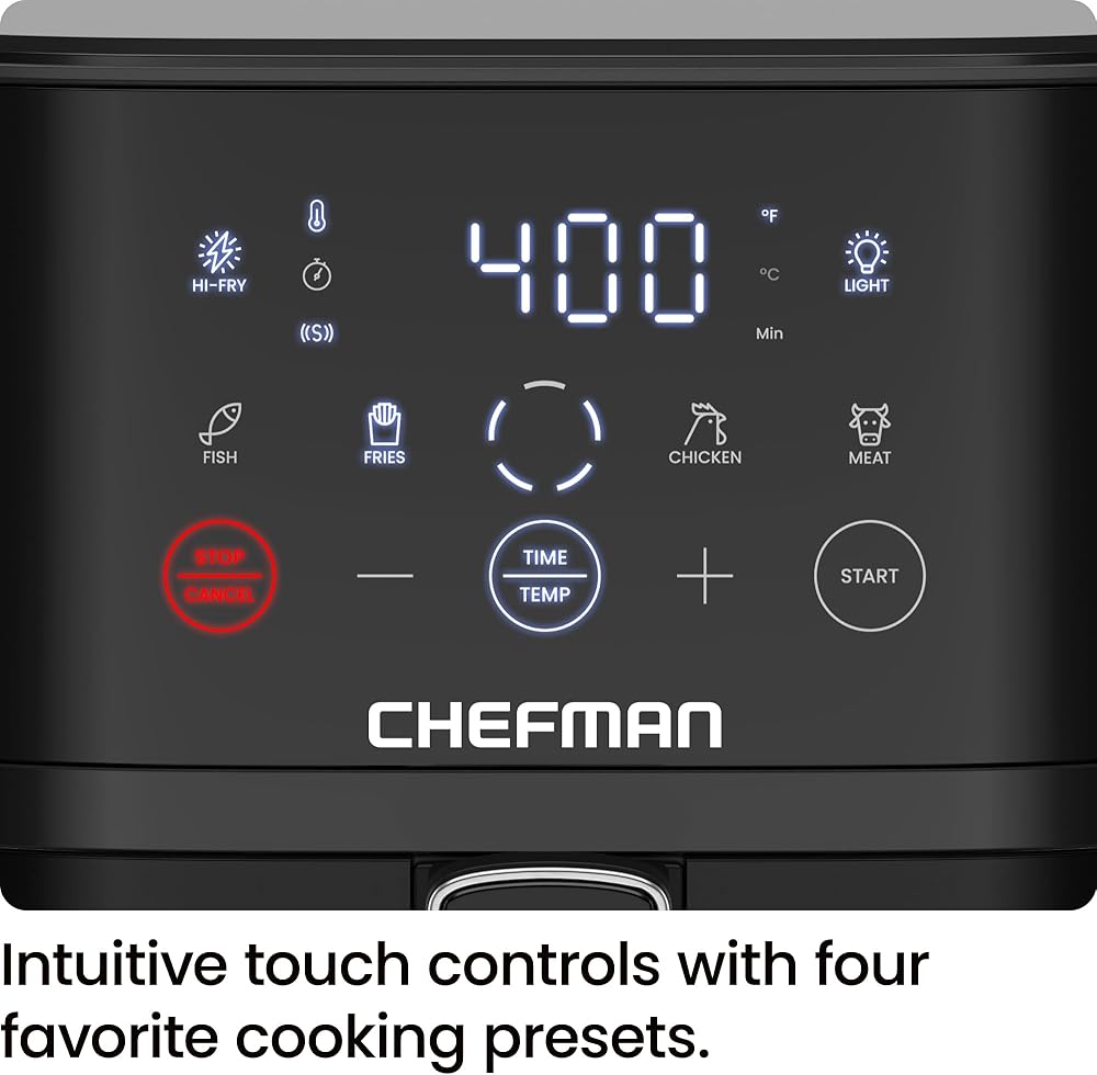 Healthy, fast cooking is within reach with the Chefman TurboFry® Touch Easy-View 6-Quart Digital Air Fryer. Air fry quickly using little to no oil and cook up to three times faster than an oven. Revitalize any limp leftovers, create perfectly crisp French fries, and cook crunchy chicken tenders with a fraction of the calories. The touchscreen user interface lets you easily select cooking time and temperature or choose from one of four popular cooking presets for an easier way to make dinner. The 6-quart capacity is ideal for cooking meals for 3-5 people. Use the Hi-Fry button during the last two minutes of cooking to increase the heat to 450°F, great for an extra-crispy final product! Watch your food fry to your perfect level of crunch with the easy-view window. The nonstick basket and rack are both top-rack dishwasher safe to make cleanup easy, and the compact frame easily fits in kitchen cabinets and drawers. For added safety, the TurboFry air fryer shuts off automatically when the basket is removed, or the timer runs out. Purchase includes a 1-year assurance from Chefman. For information on how to use your product, scroll down for a PDF User Guide. 1700W/120V – RJ38-6TW-BLACK