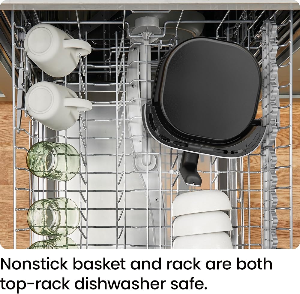 SIMPLE CLEAN-UP: The 6-quart nonstick basket and rack are both dishwasher safe, making clean-up quick and easy. The stylish matte-black finish is timeless and easy to wipe clean with a damp cloth.