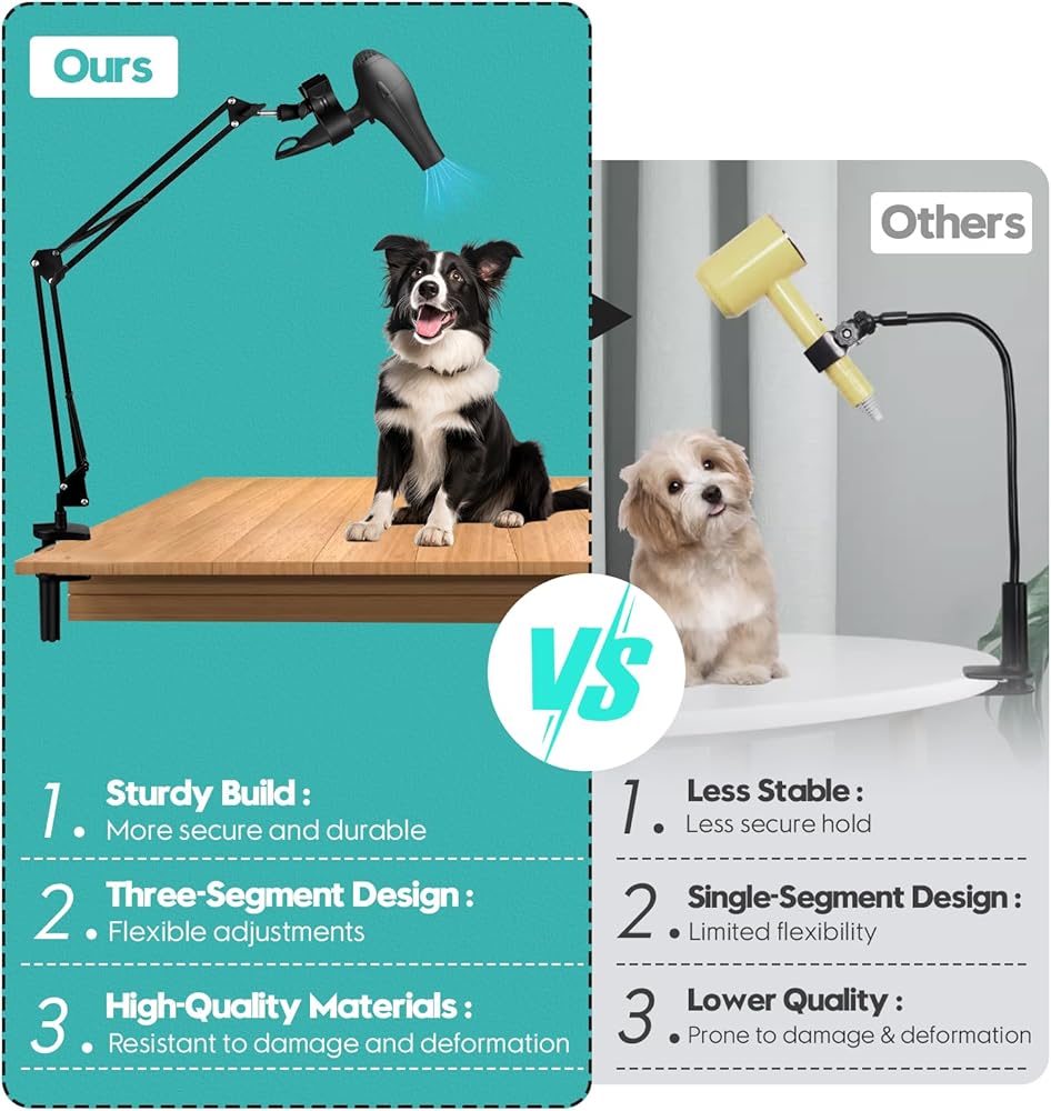 حامل مجفف شعر للكلاب، حامل مجفف شعر لطاولة العناية بالحيوانات الأليفة، حامل مجفف شعر قابل للدوران 360 درجة بدون استخدام اليدين، مع مشبك قابل للتعديل لتصفيف الكلاب والقطط، يناسب معظم مجففات الشعر وخراطيم المجفف