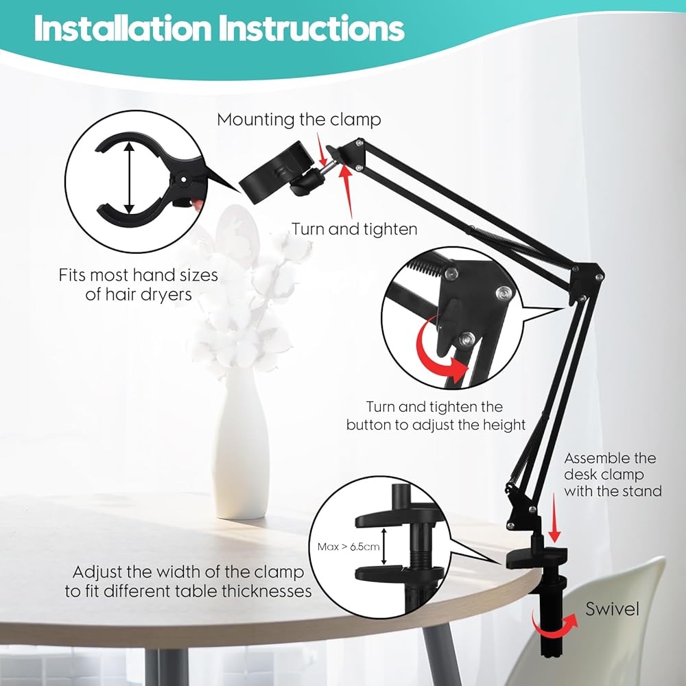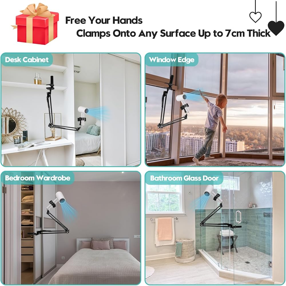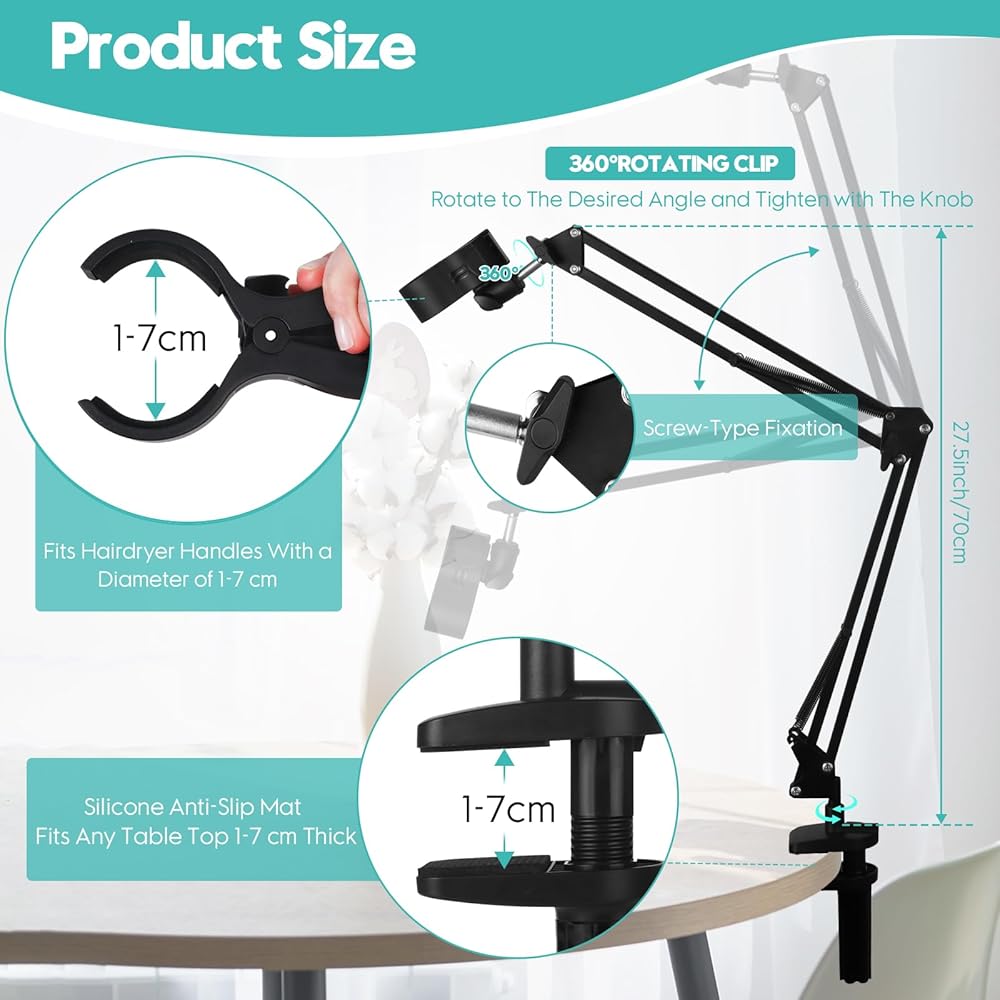 • 【مشبك دوار 360 درجة】 يوفر مشبك مقبض مجفف الشعر وحامل الذراع دورانًا كاملاً بزاوية 360 درجة، مما يسمح بوضع متعدد الاستخدامات. يمكن تعديل الحامل إلى أقصى ارتفاع 70 سم. ما عليك سوى ربط الزر لتثبيته في مكانه بالزاوية والارتفاع المطلوبين لاستخدام مثالي بدون استخدام اليدين.