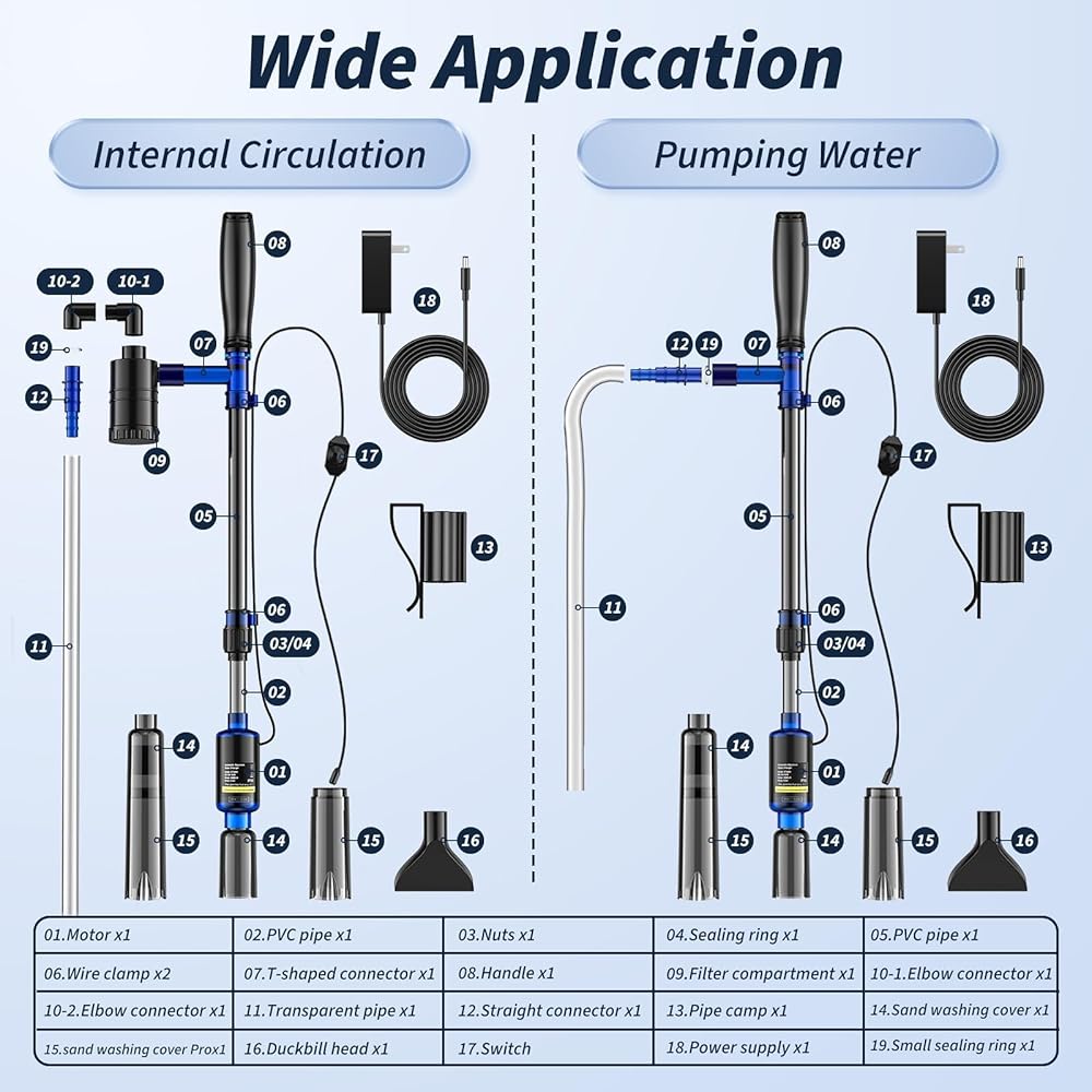 Mildhug fish tank cleaner vacuum Our electric aquarium cleaning kit is equipped with a high-efficiency electric motor that easily extracts dirt and debris from the bottom, ensuring clear and transparent aquarium water and creating an ideal environment for your aquarium ecology. The fish tank cleaner with Water Changer + Sand Cleaner + Fish Debris Cleaning + Water Filter + Water Shower + Suction 6 in 1 functions. You can easily clean the fish tank, the aquarium siphon pumps strong suction and large flow, making it easy to clean the dirt from the bottom of your aquarium. Package Included: Motor*1, PVC pipe*2, Nuts*1, Sealing ring*1, Wire clamp*2, Wire clamp*2, T-shaped connector*1, Handle*1, Filter compartment*2, Elbow connector*2, Corrugated pipe*1, Straight connector*1, Pipe clamp*1, Sand washing cover*1, Sand washing cover Pro*1, Duckbill head*1, Power supply*1, User manual*1. You can read the manual or check the operation video before assembling and using it. If you have any problem using it, please contact us, and we will reply to you within 24 hours. We also come with a duckbill head that not only removes sediment from the bottom but also effortlessly cleans the glass surface. Maintaining the overall cleanliness of the aquarium and keeping your aquarium world refreshed.